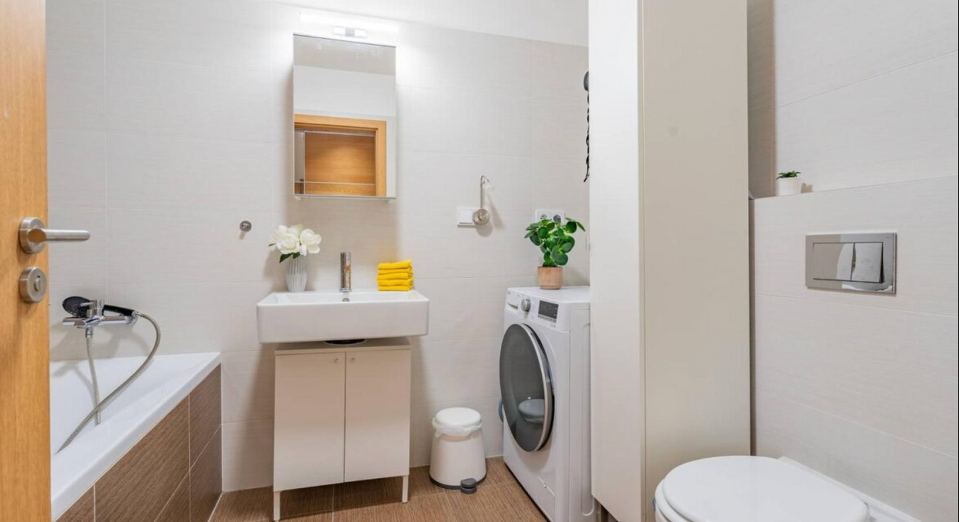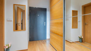 Byt o výmere 30 m2 pozostáva z kúpeľne s vaňou, toaletou a priestorom na umiestnenie práčky, ďalej zo vstupnej chodby s odkladacím priestorom vďaka roll-door skrini, priestrannej miestnosti s plne zariadenou kuchyňou a rozkladacou pohovkou a s TV, kde sa nachádza aj výstup na balkón s výhľadom na okolie.
