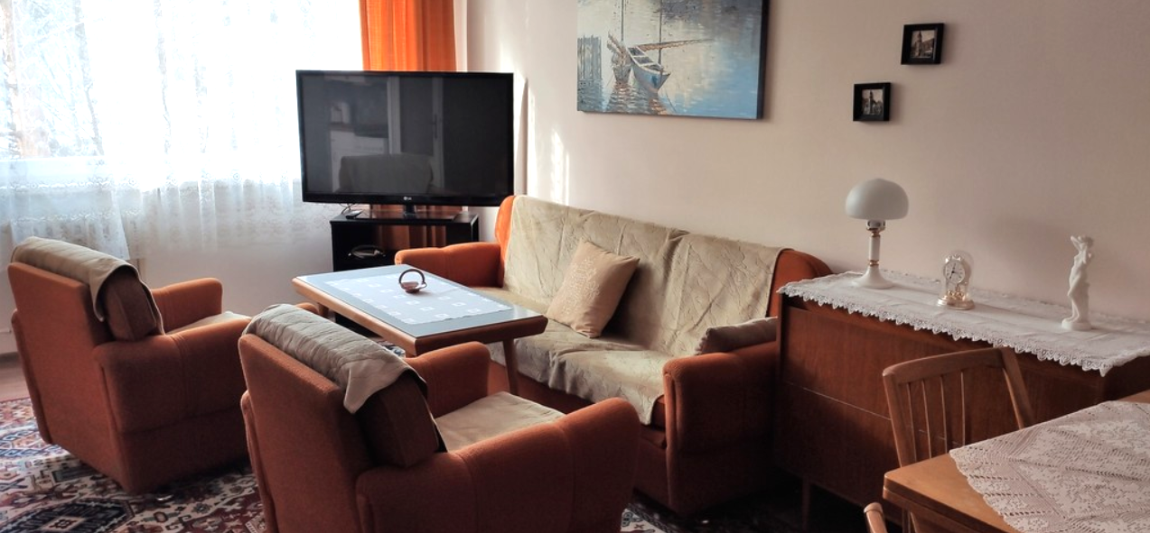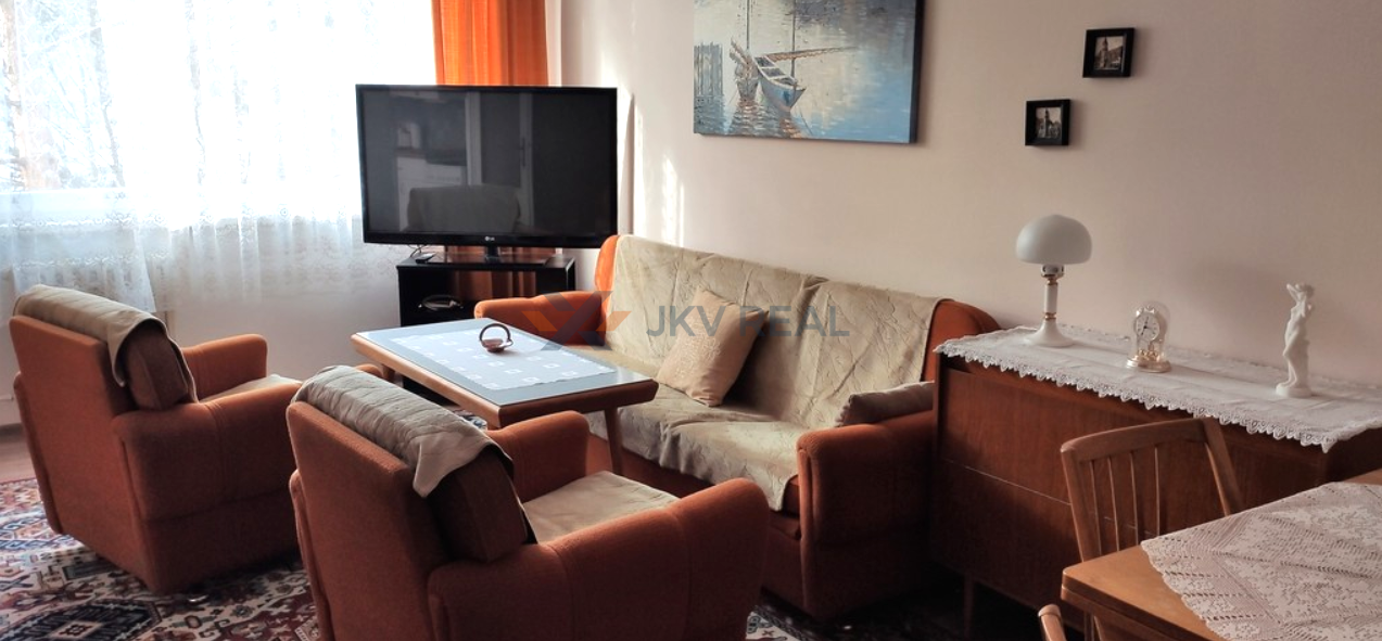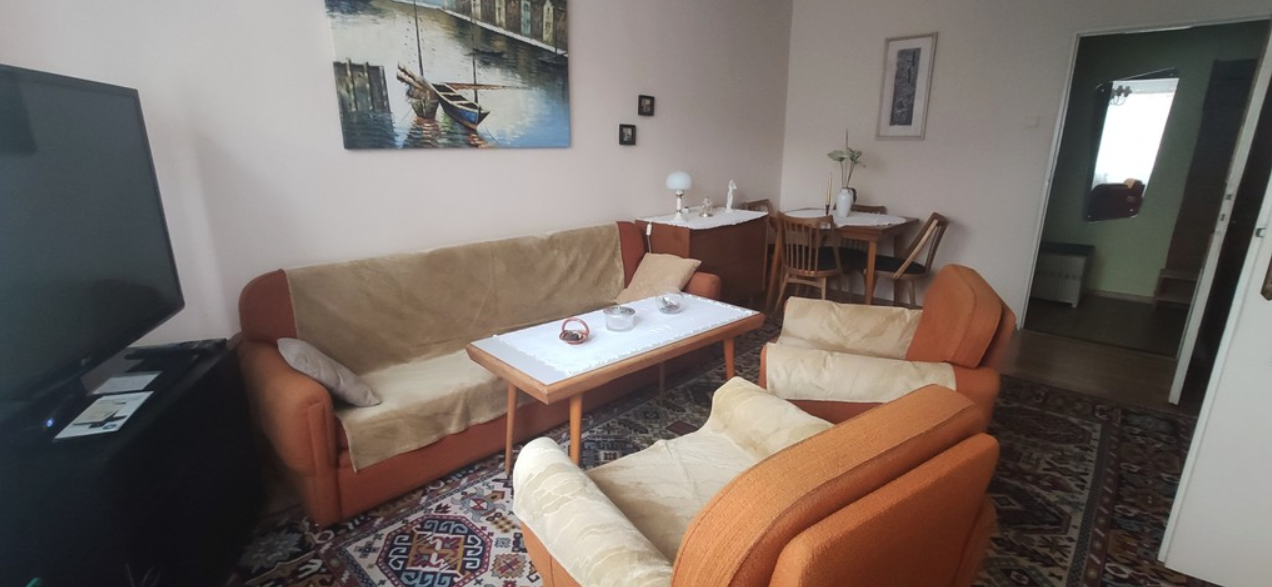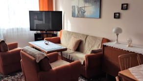 kompletne zariadený (bezpečnostné dvere, vstavané skrine, 2 postele, sedacia súprava, TV, chladnička s mrazničkou, mikrovlnná rúra, umývačka riadu, práčka, presklený balkón).