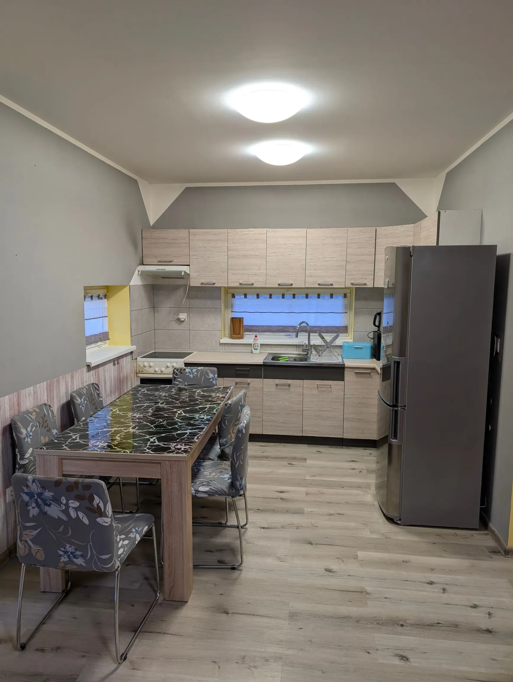 - Priestranná obývačka spojená s kuchyňou a jedálňou