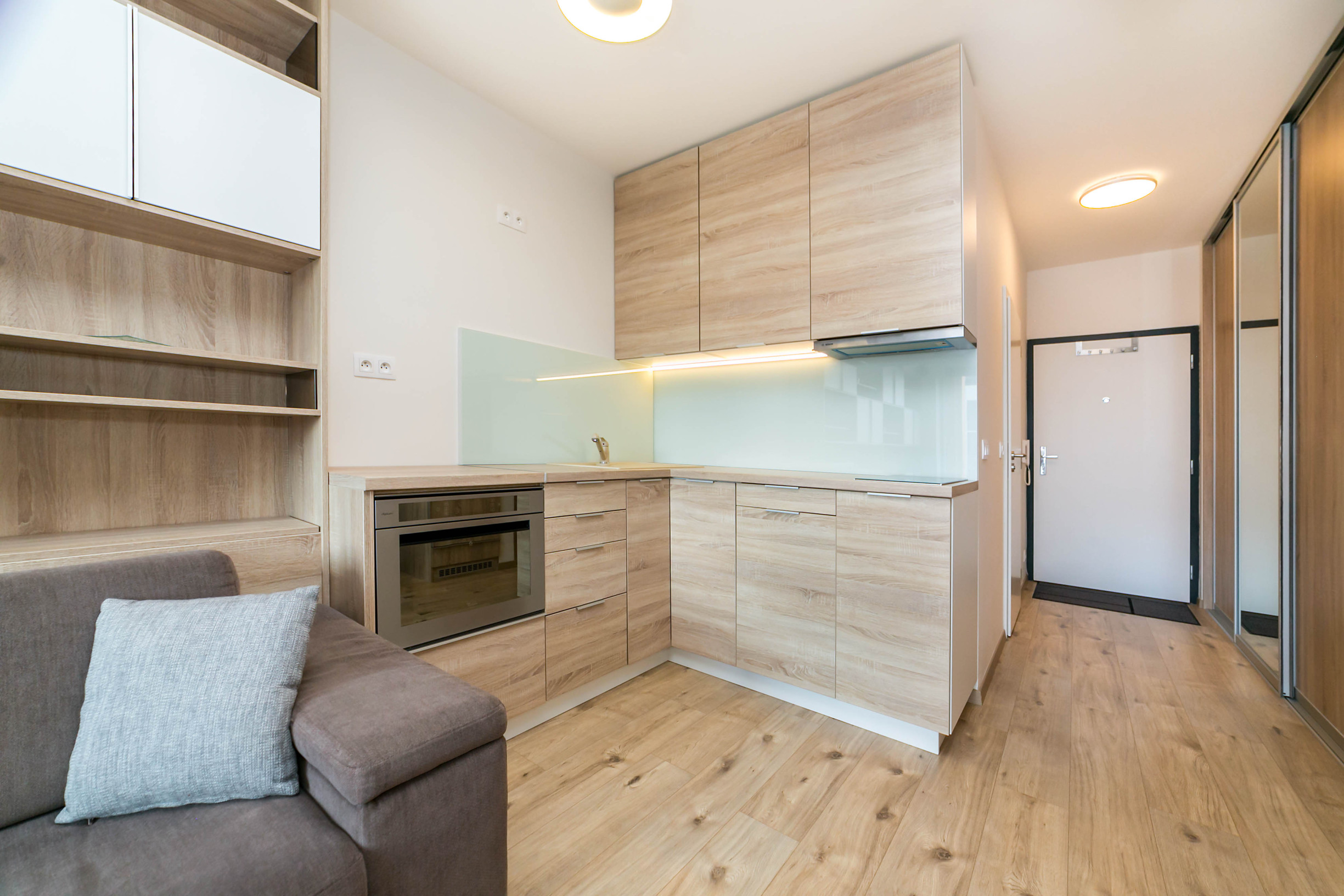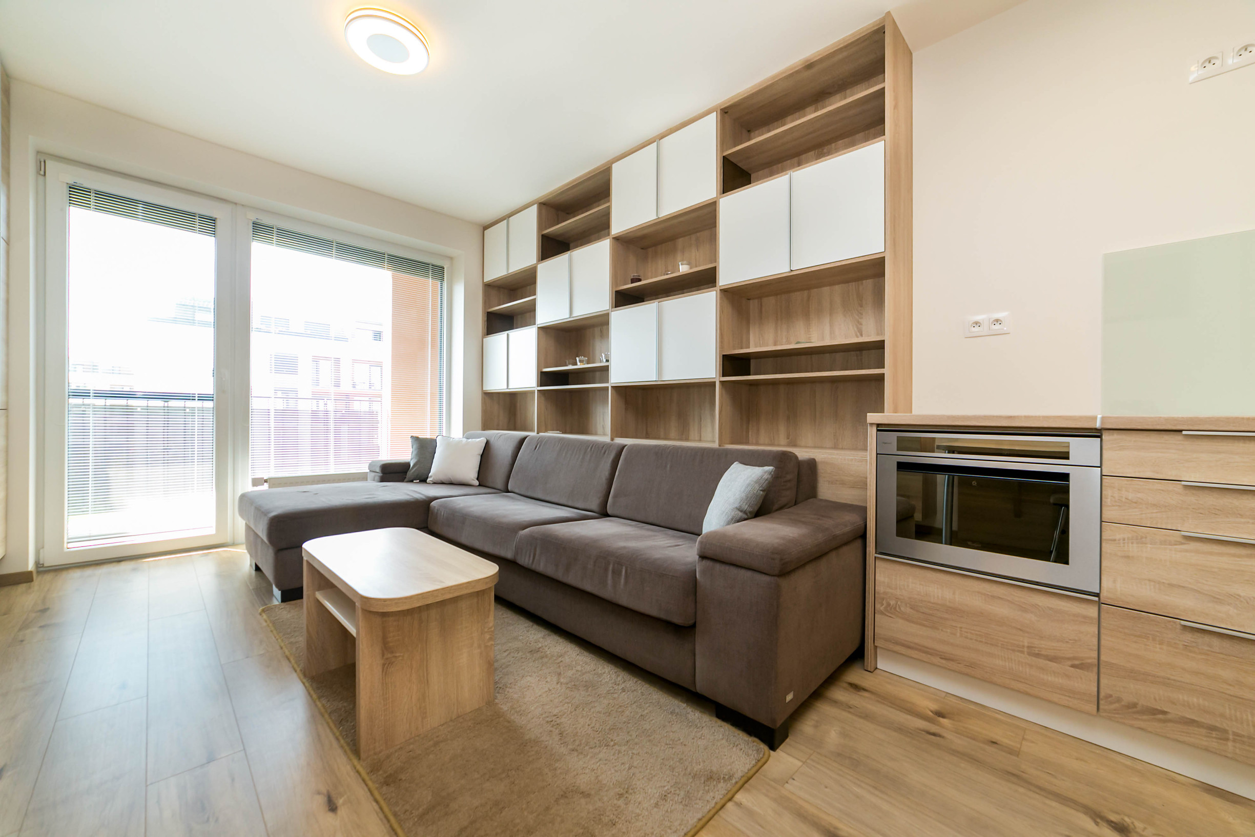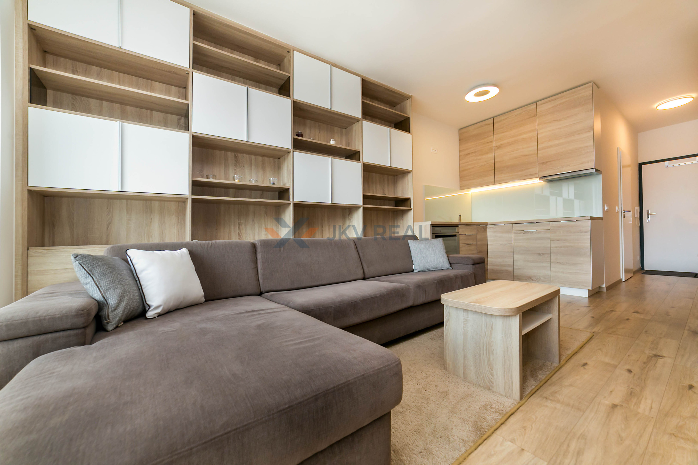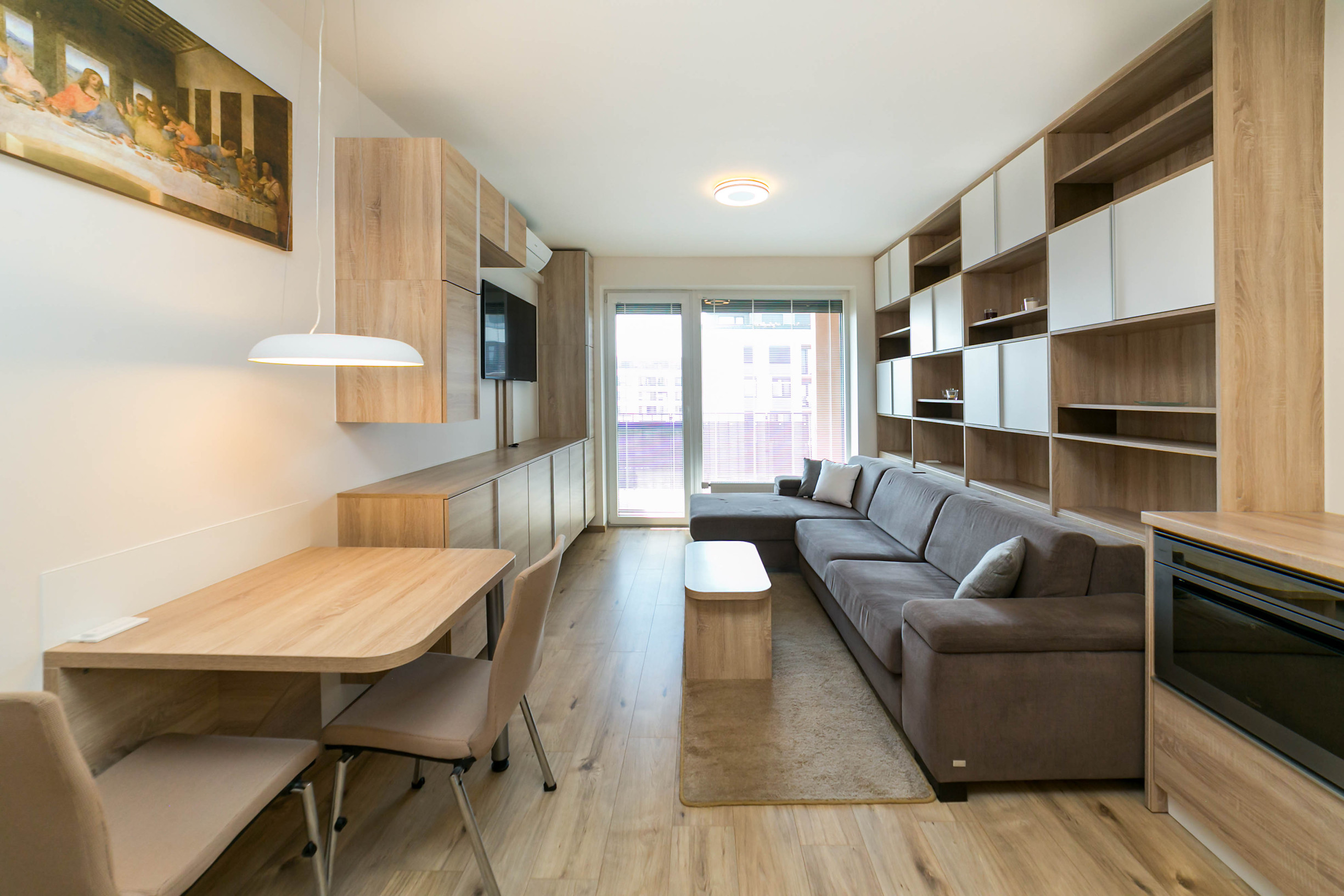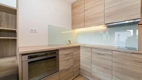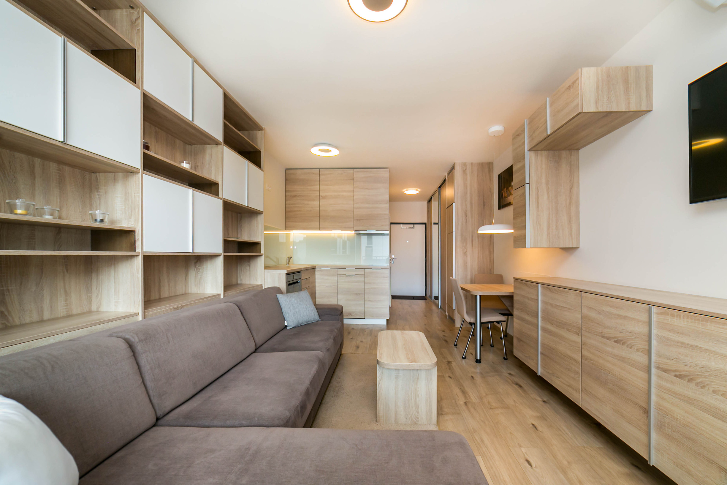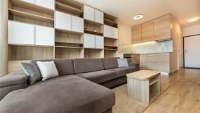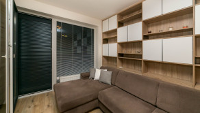 Dominantou bytu je nábytok vyrobený na mieru, ktorý elegantne prepája obývaciu časť s kuchyňou. Každý detail má svoje miesto. Byt pôsobí harmonicky, útulne a zároveň moderne.