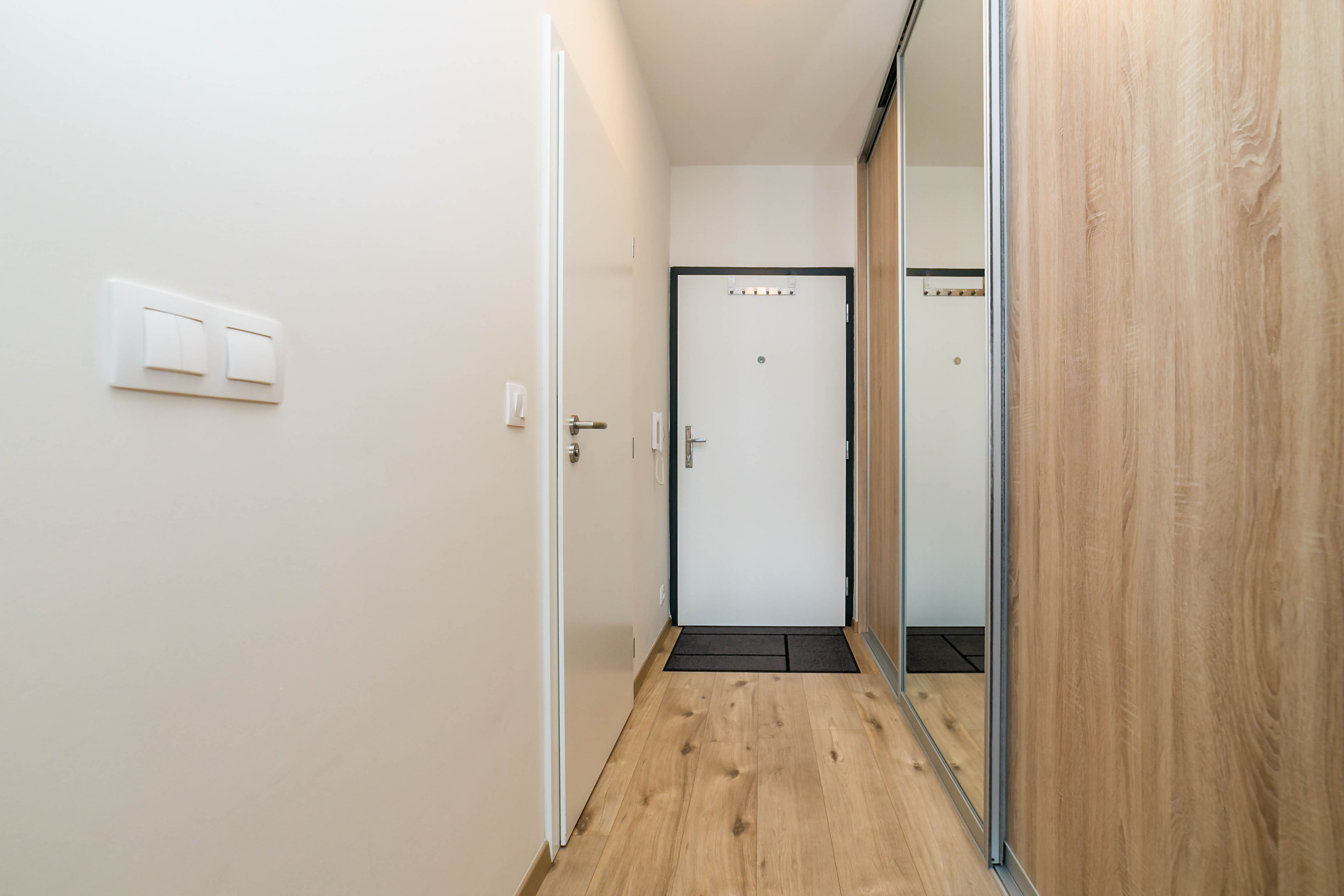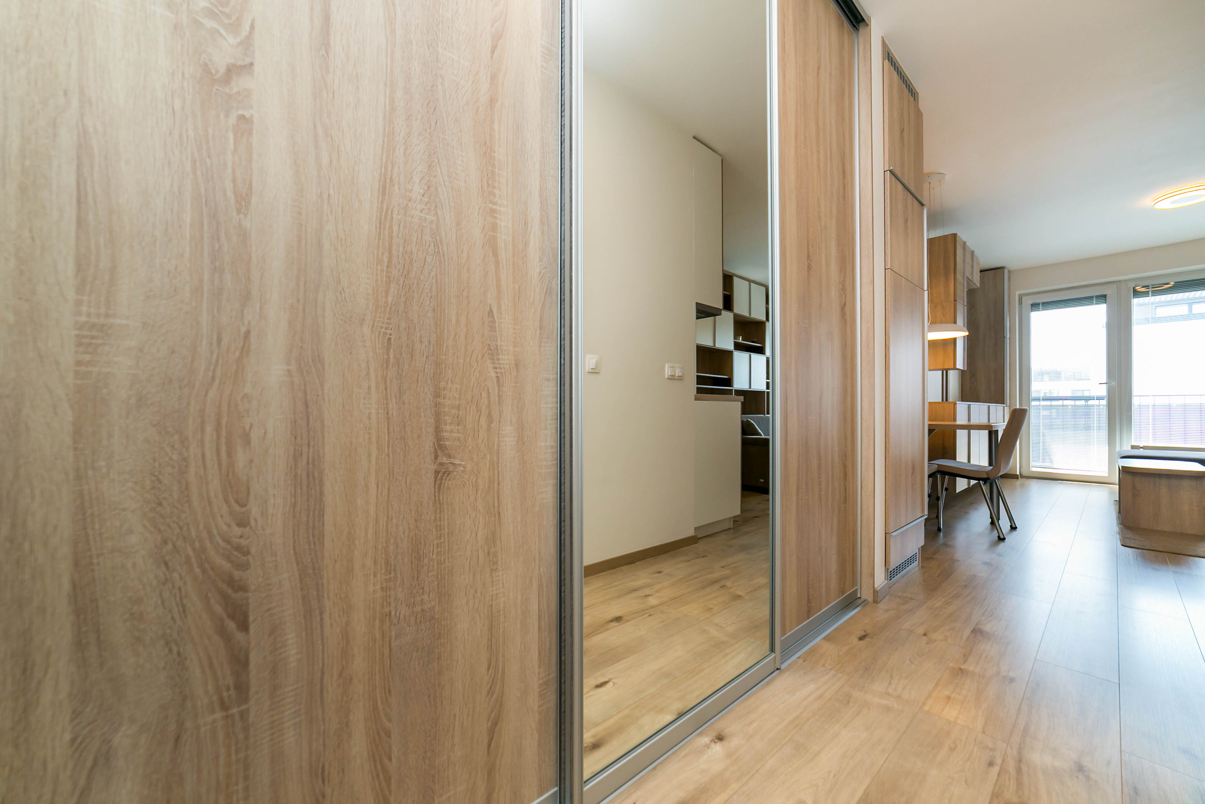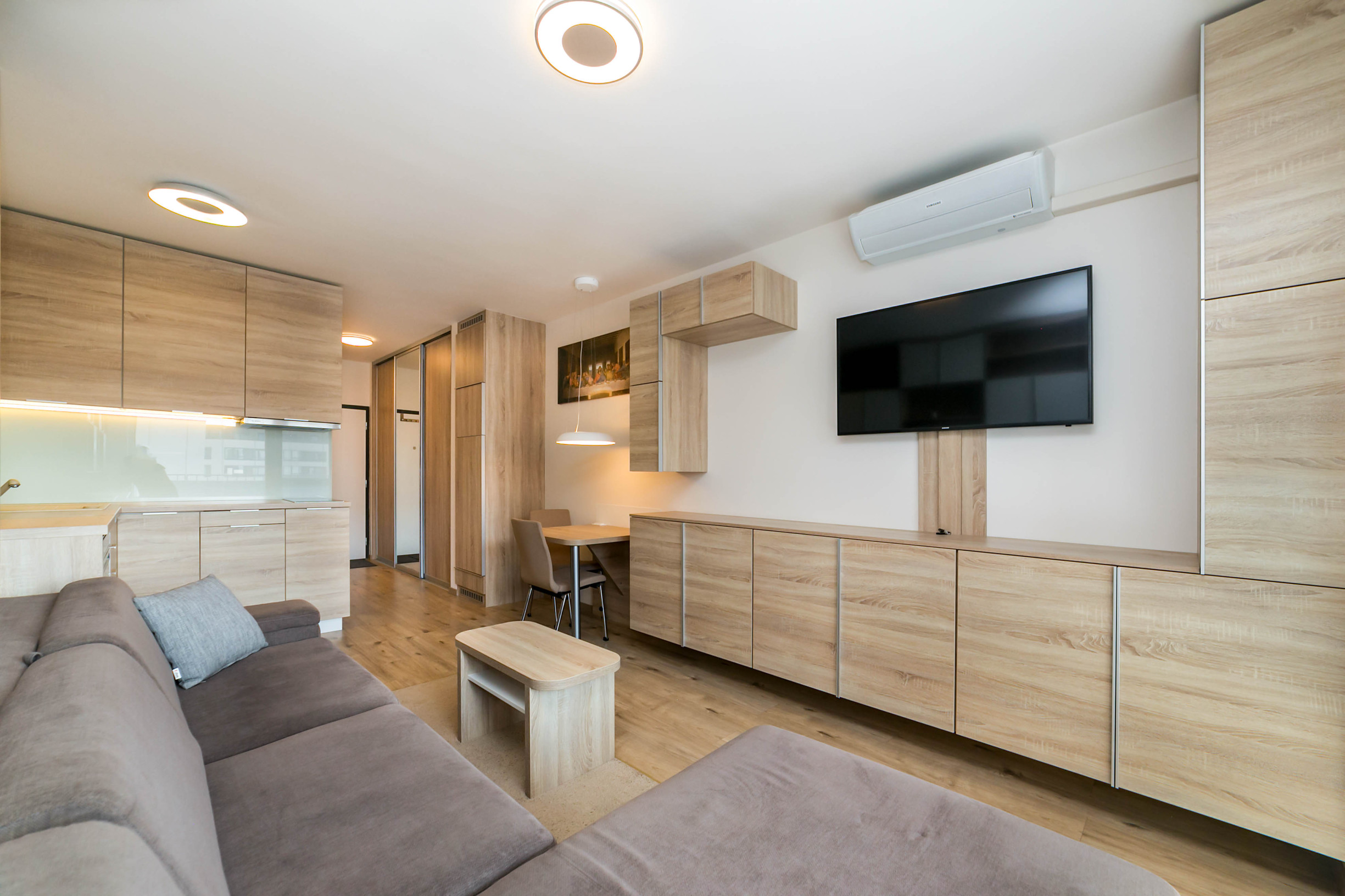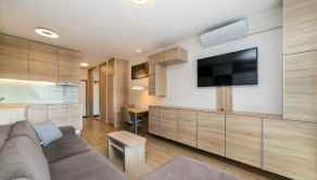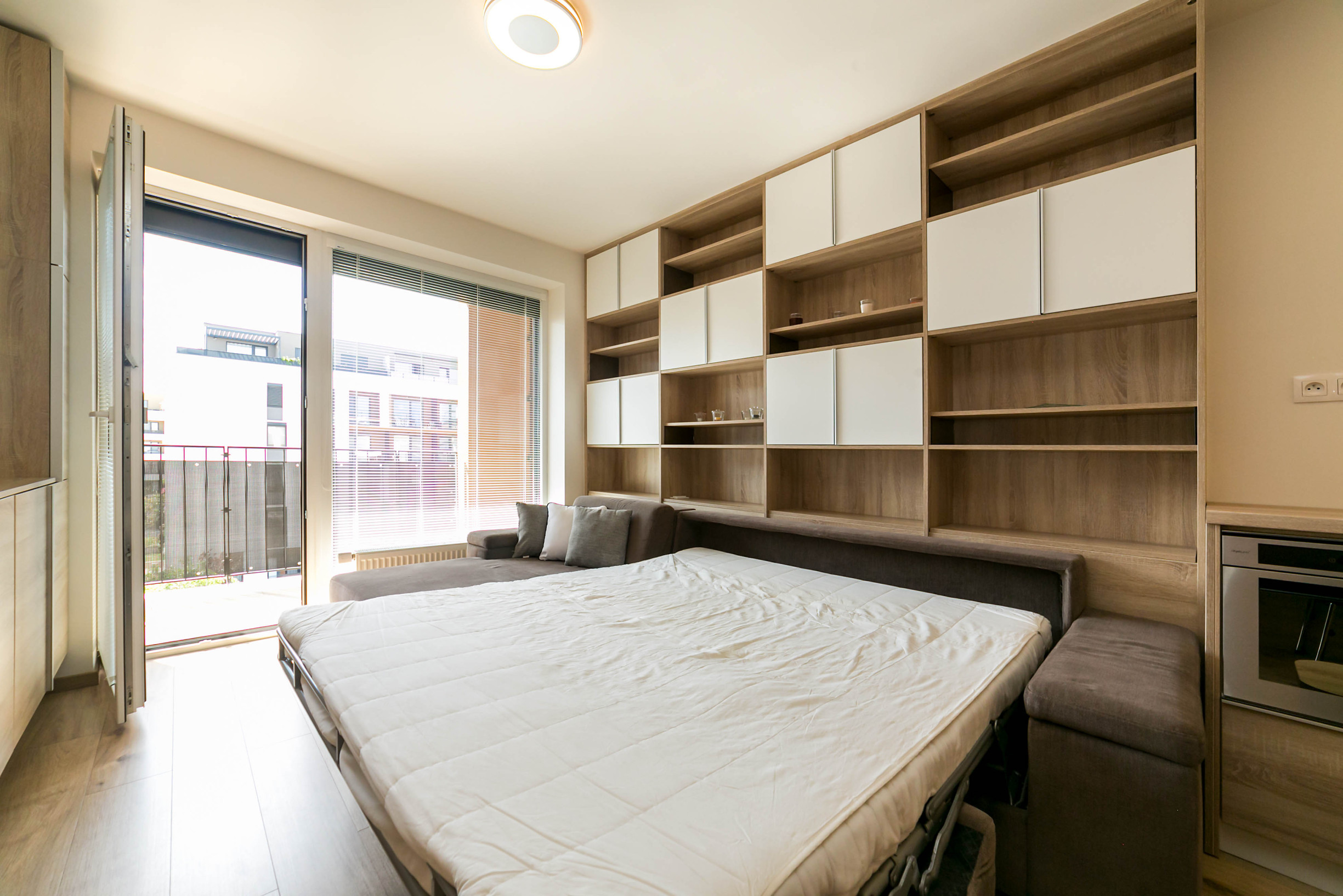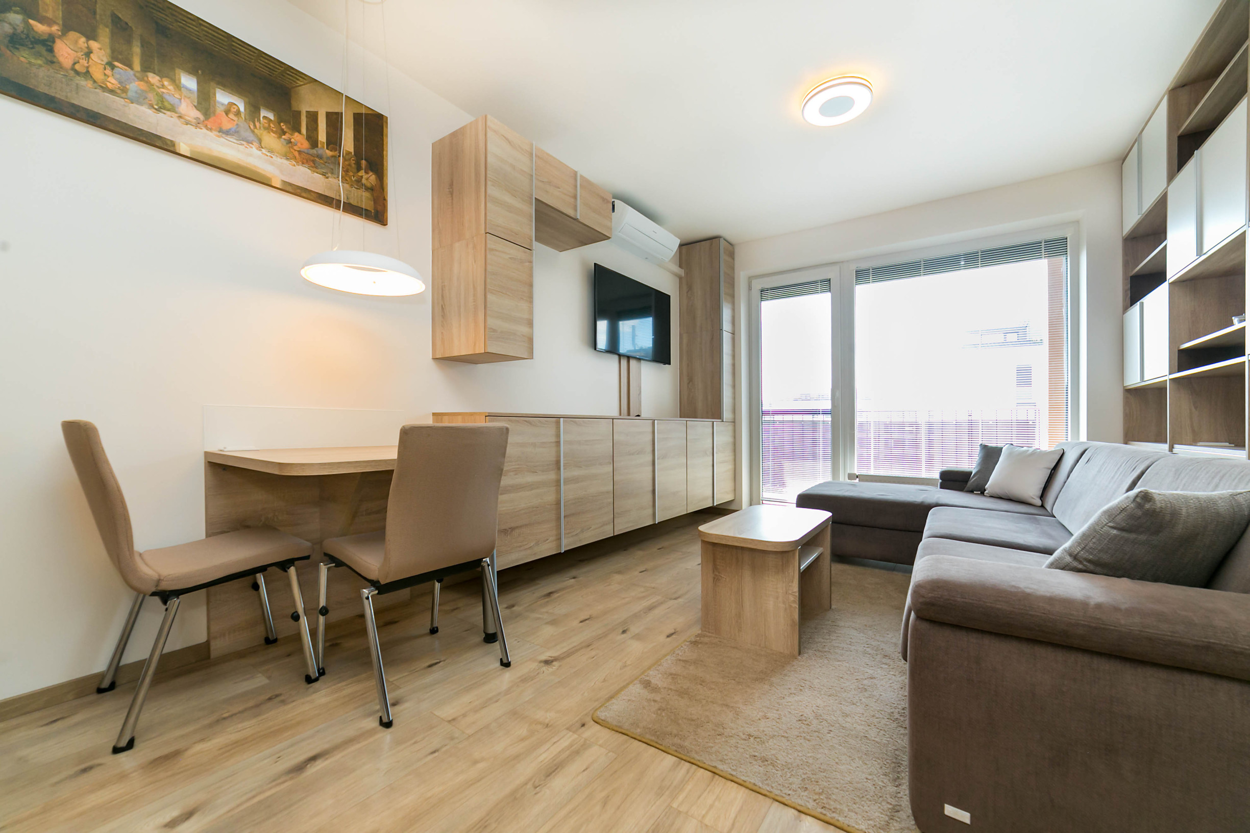 Dominantou bytu je nábytok vyrobený na mieru, ktorý elegantne prepája obývaciu časť s kuchyňou. Každý detail má svoje miesto. Byt pôsobí harmonicky, útulne a zároveň moderne.