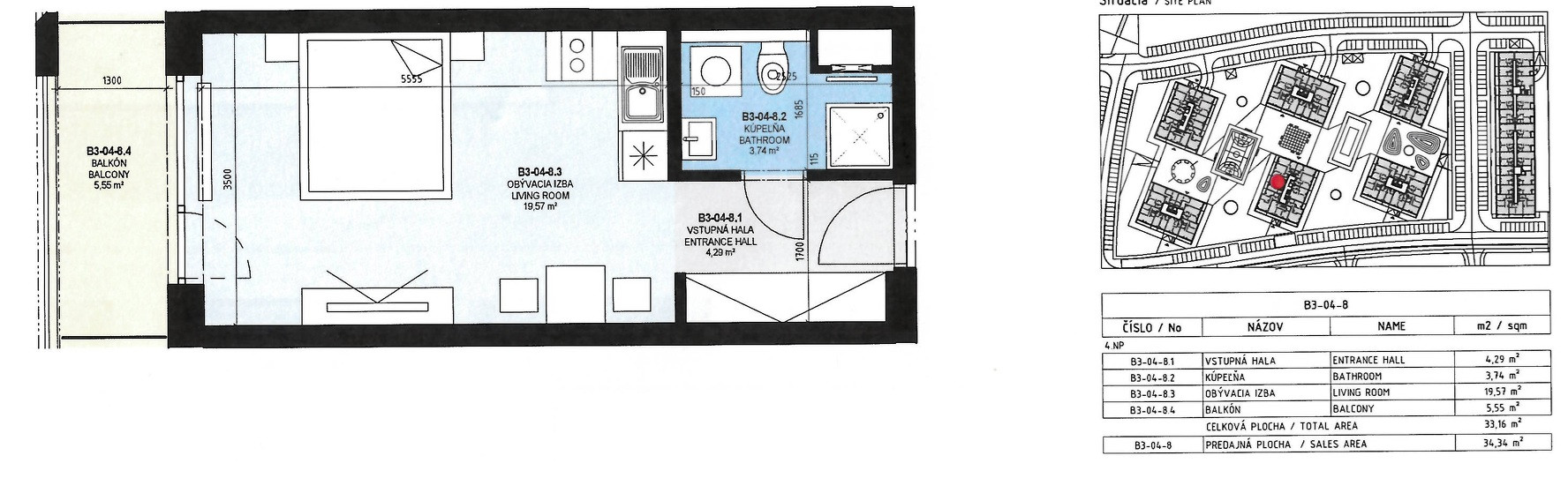 Celková výmera bytu je 33 m² vrátane loggie (5,55 m²) a nachádza sa na 3. poschodí z 5 v modernom bytovom dome s výťahom.