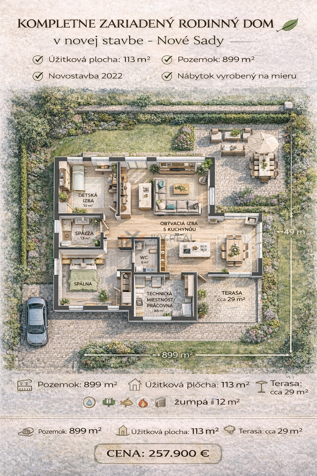 Ponúkame na predaj kompletne zariadený moderný rodinný dom v obci Nové Sady, vzdialenej iba približne 18 minút jazdy od Nitry.