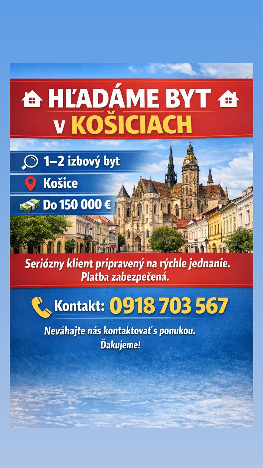 V prípade ponuky ma kontaktujte na telefónnom čísle 0918 703 567 alebo zašlite Vašu ponuku na zivcakova@jkvreal.sk