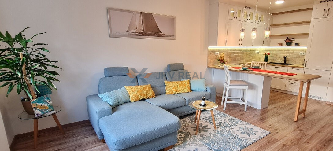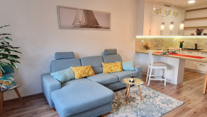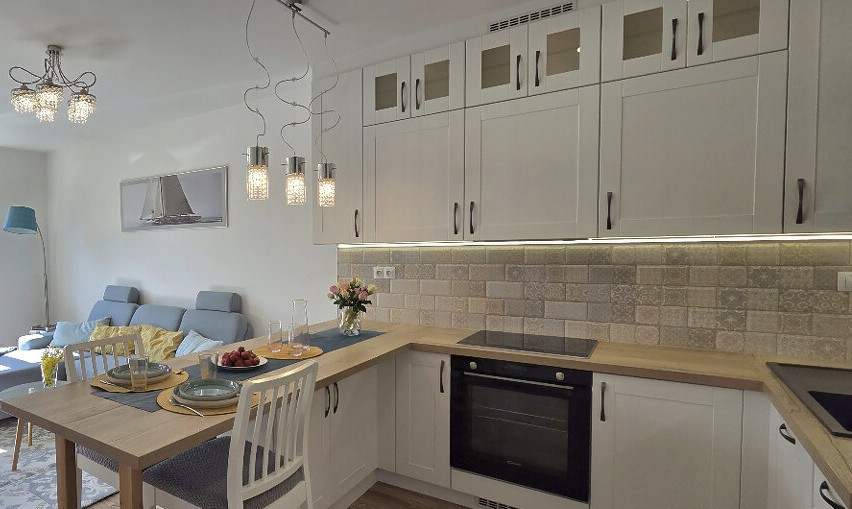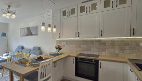 - moderná kuchyňa vybavená vstavanými spotrebičmi: mikrovlná rúra, elektrická rúra, indukčná doska, umývačka riadu, chladnička s mrazničkou