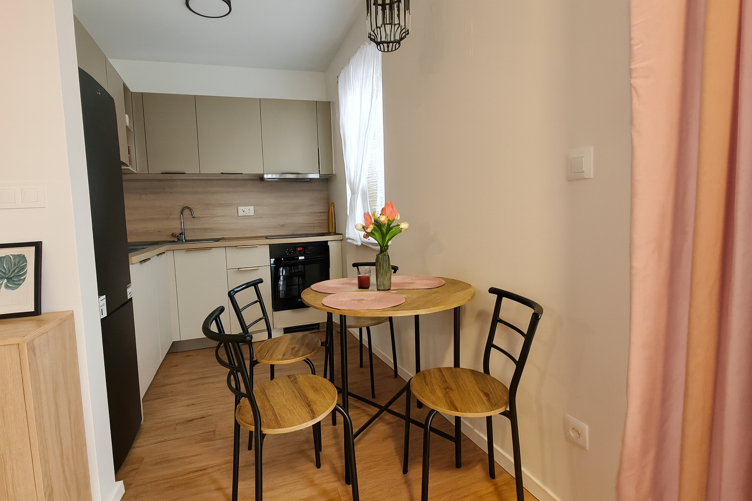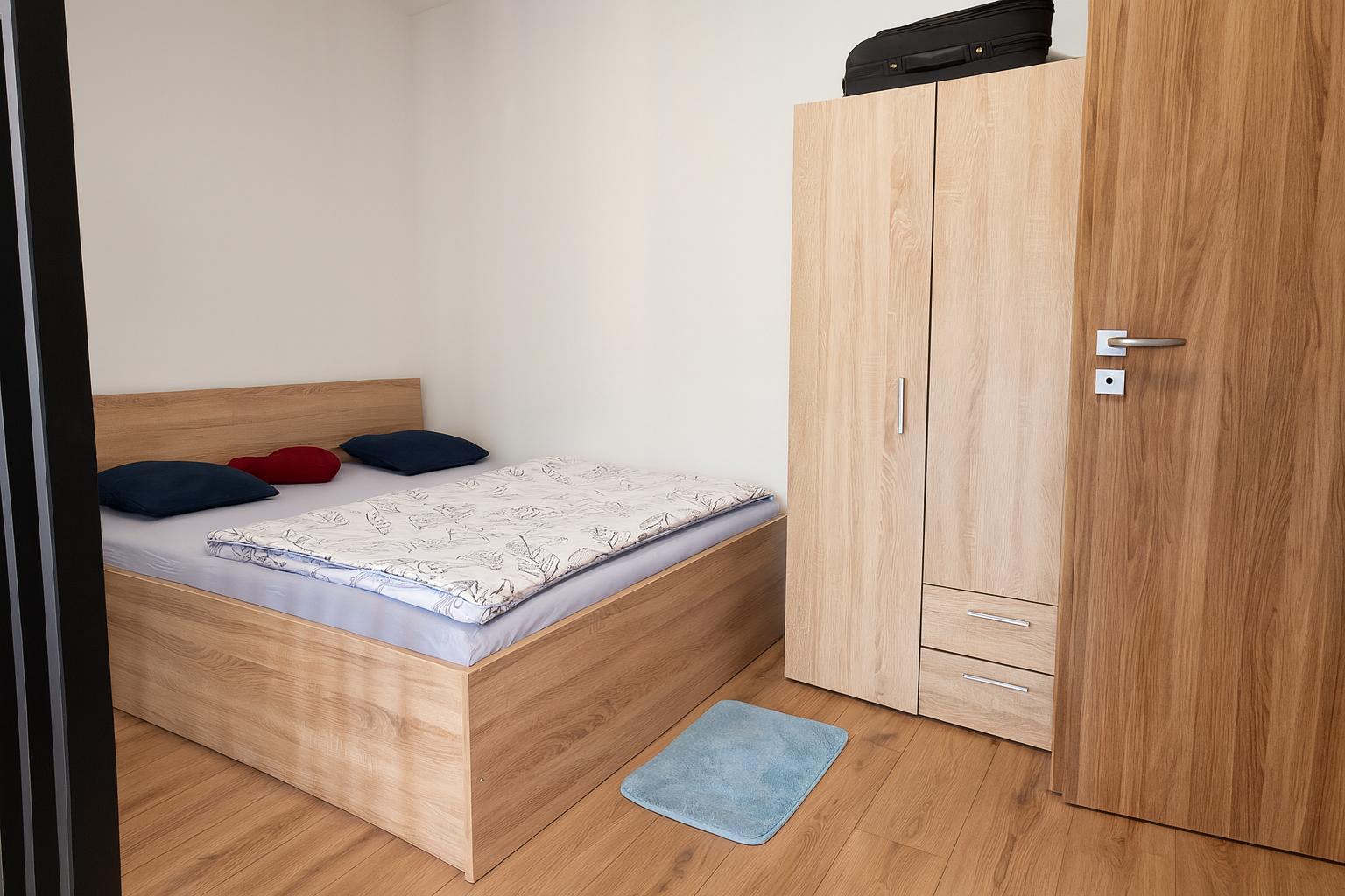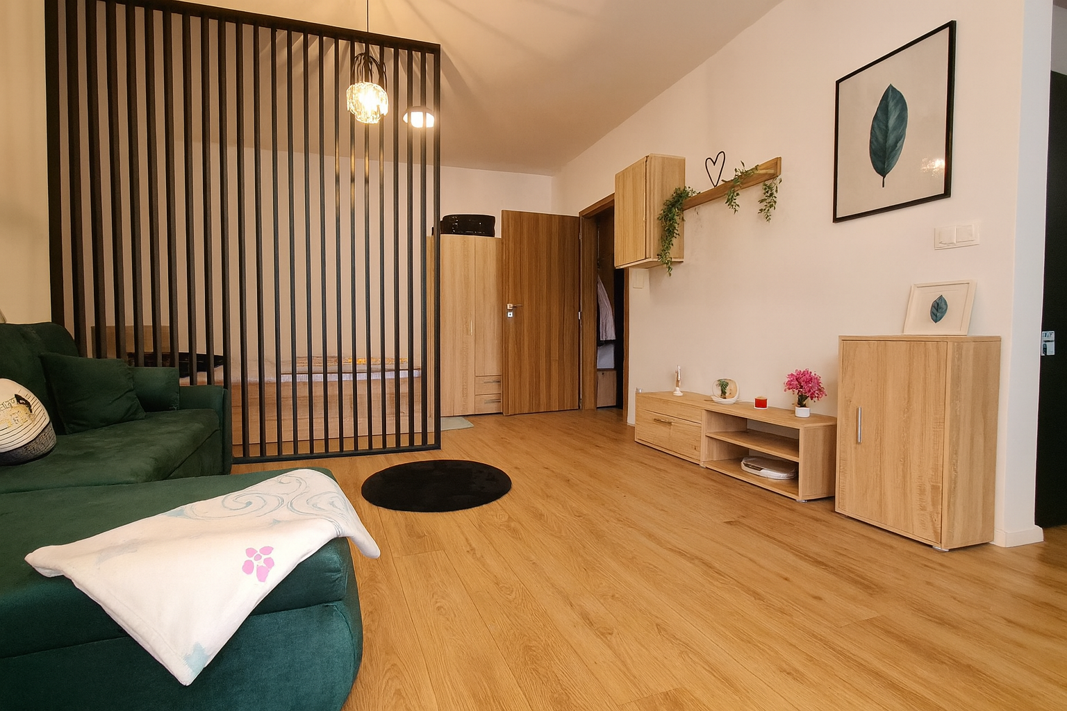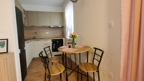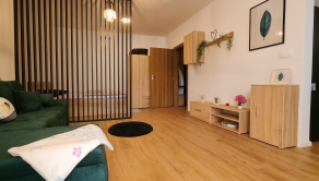 Byt je dispozične riešený s dôrazom na funkčnosť – priestranná obývacia izba s kuchynským kútom, moderná kúpeľňa a vstupná chodba s úložným priestorom