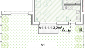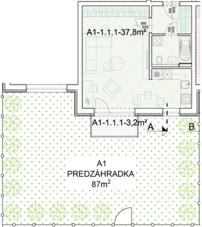 Tento byt s predzáhradkou zahŕňa nadštandardné vyhotovenie (štandard + kuchynská linka bez elektrospotrebičov, vrátane digestora).