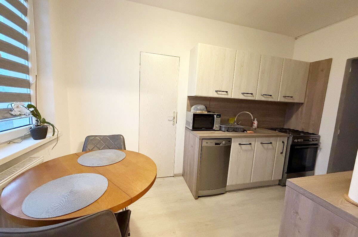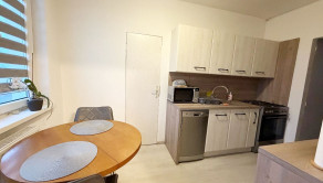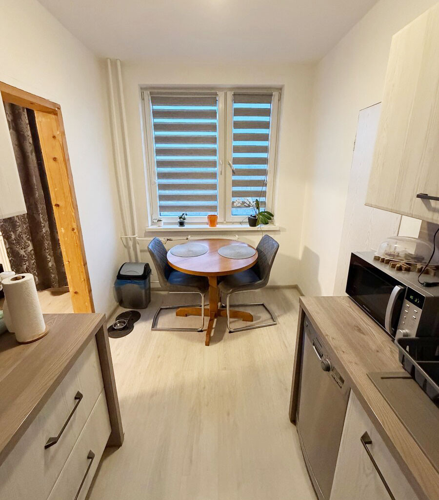 Vybavenie: Kuchynská linka na mieru s praktickou komorou, vstavané skrine a bezpečnostné vstupné dvere.