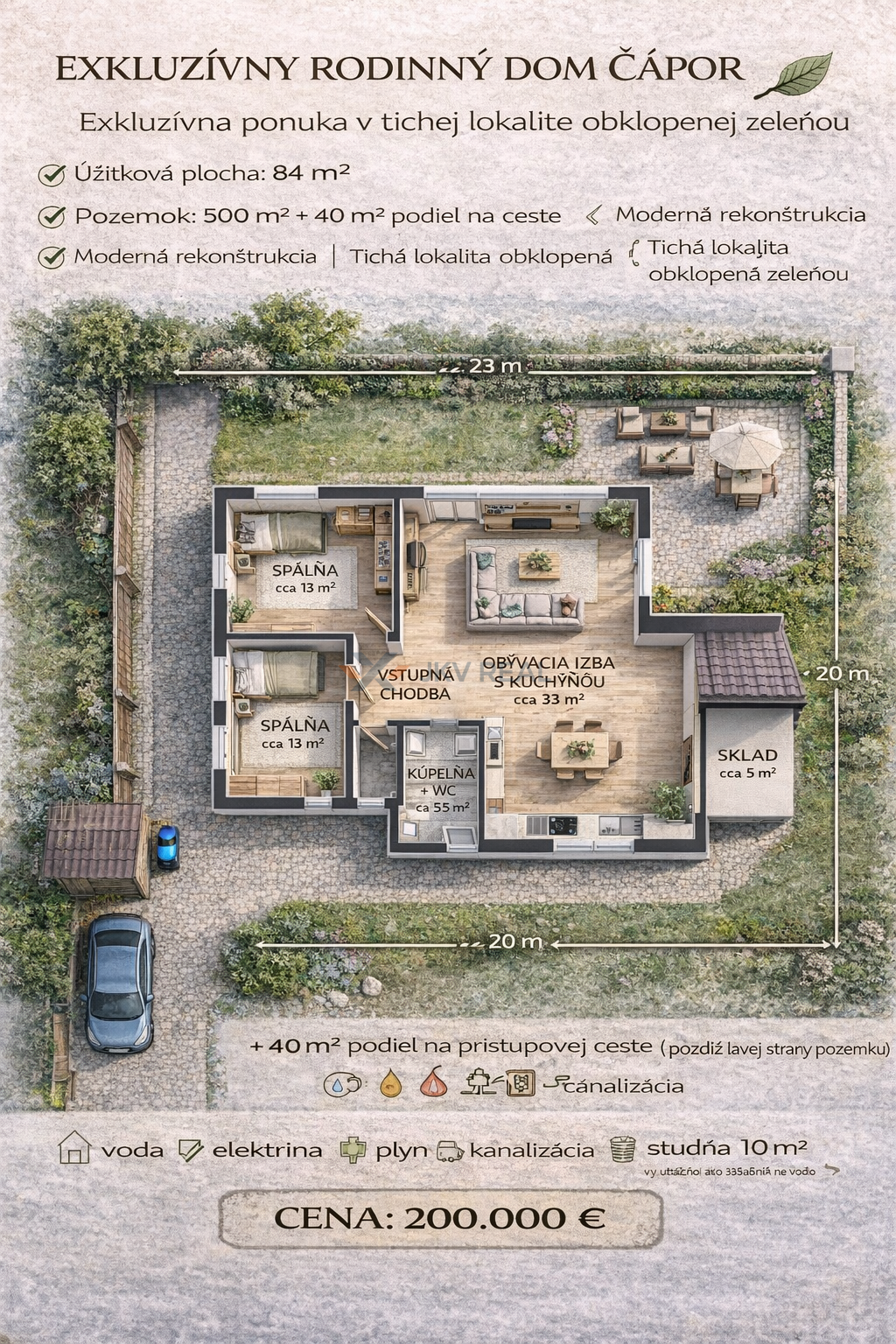 ✔ nové prípojky: elektrina, plyn, kanalizácia (už zrealizované)