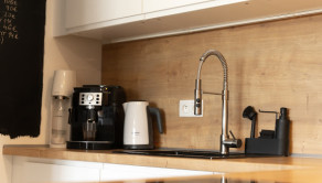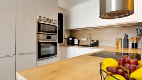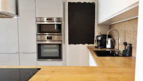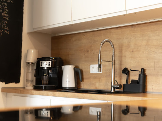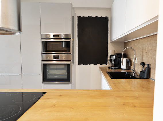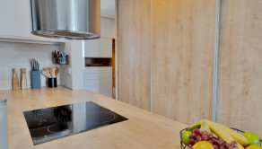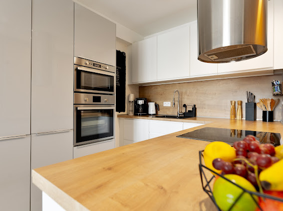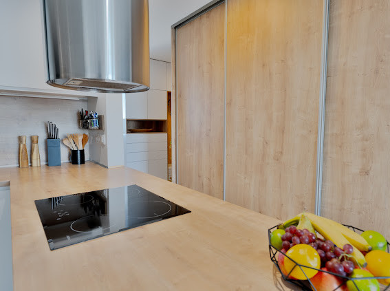 Kuchyňa je vybavená vstavanými spotrebičmi a navrhnutá tak, aby bola praktická a zároveň elegantná.