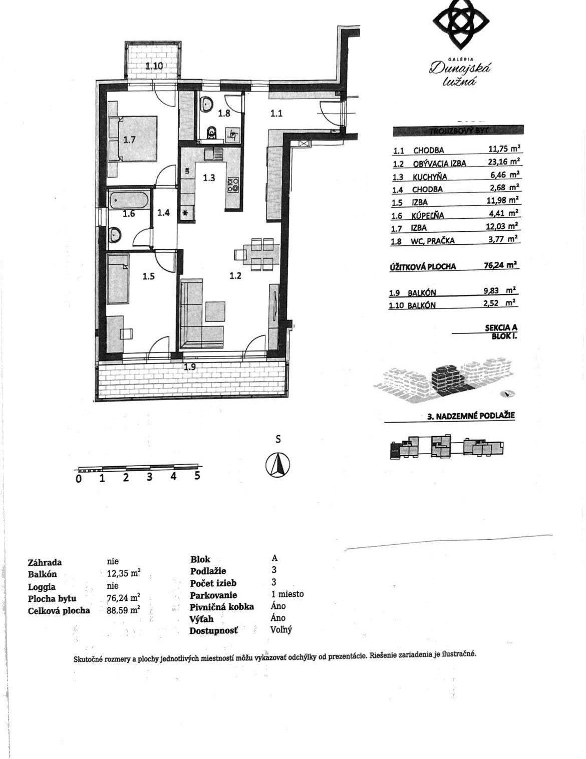 Silnou stránkou bytu sú dva vonkajšie priestory – balkón (2,52 m²) a priestranná 9 m² loggia s výhľadom na zeleň.