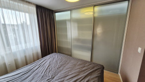 - Samostatnú spálňu, ladenú v príjemných tónoch dopĺňa podsvietená vstavaná skriňa s množstvom miesta na odkladanie a manželská posteľ 200 x 180 cm s úložným priestorom