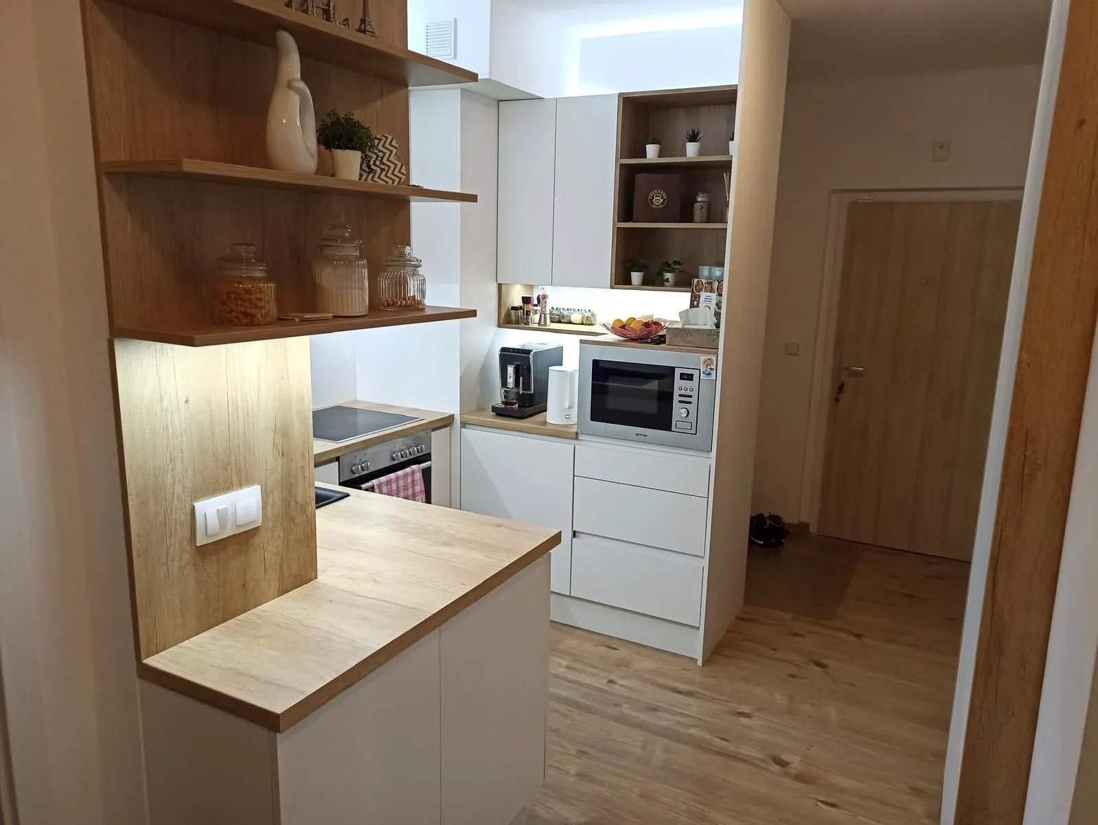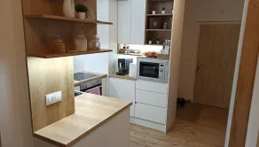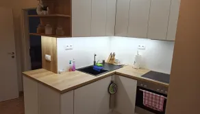 - moderná kuchynská linka so vstavanými spotrebičmi: elektrická rúra, elektrická varná doska, mikrovlnka, umývačka riadu