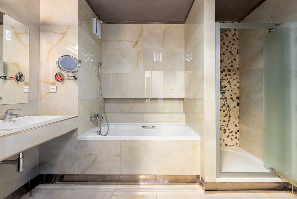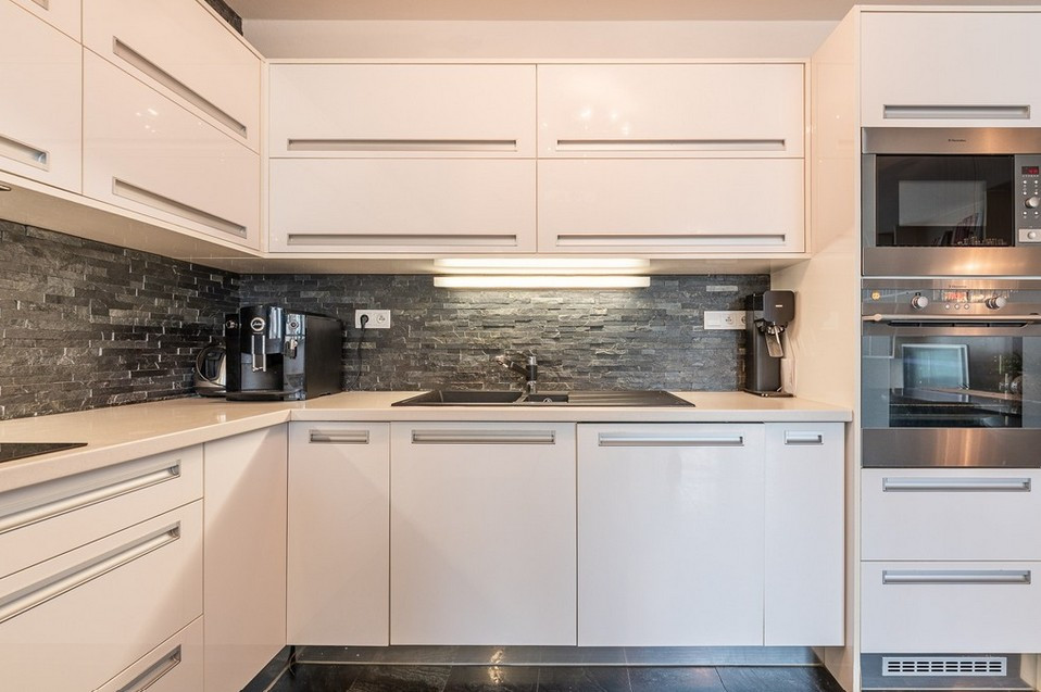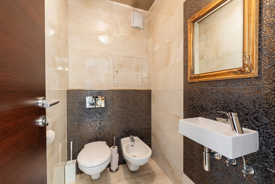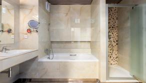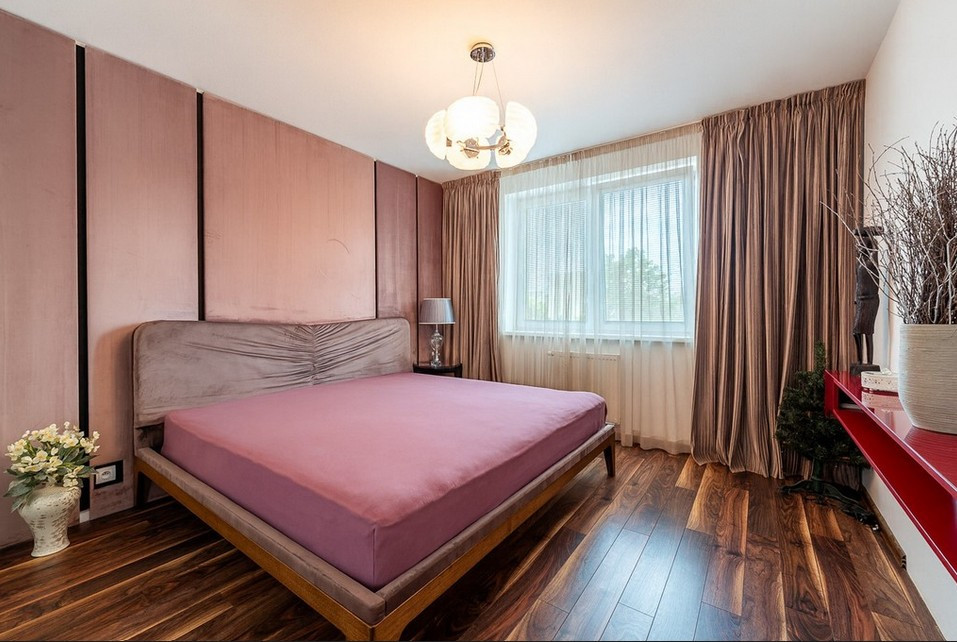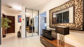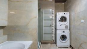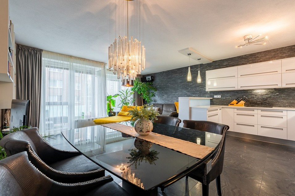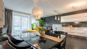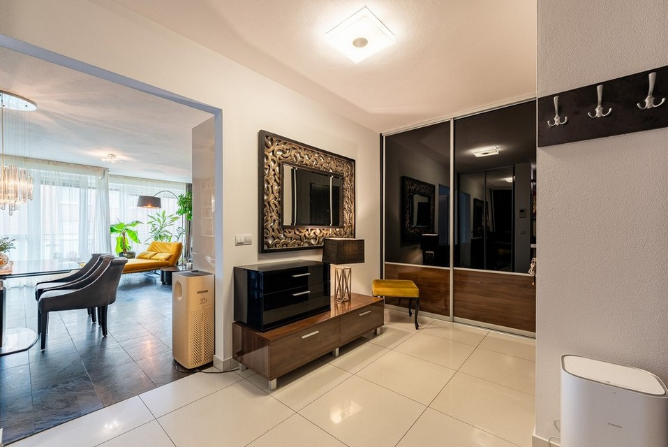 Byt má vstupnú halu, dominantnú otvorenú dennú časť - obývačku prepojenú s jedálňou a kuchyňou, 3 veľké spálne, veľkú kúpeľňu s vaňou a sprchovacím kútom obloženú mramorom z Maroka a samostatným WC s bidetom . Interiér bol navrhnutý architektonickým štúdiom a dopĺňajú ho elegantné materiály, luxusné kamenné obklady, drevená podlaha či veľkoformátová talianska dlažba. Byt prešiel čiastočnou rekonštrukciou v roku 2020.