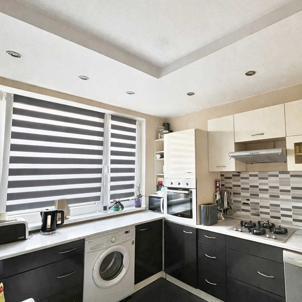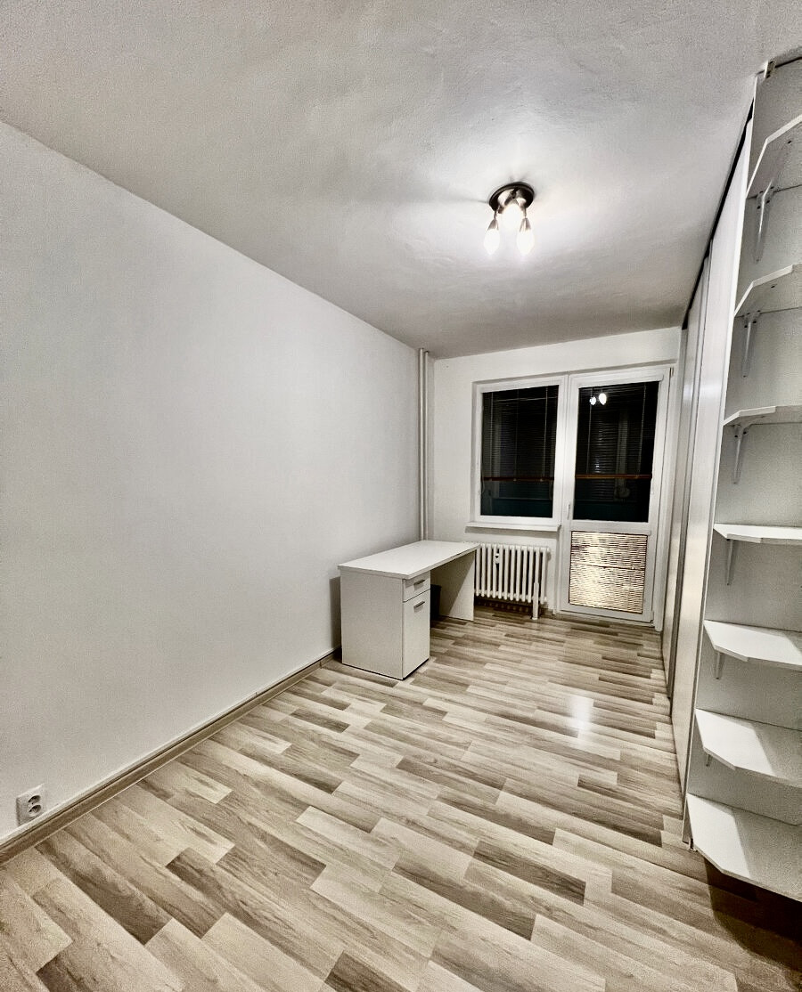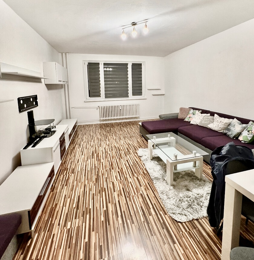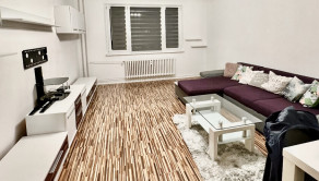 Byt je po rekonštrukcií, plastové okná, laminátové podlahy, dlažba, zárubne a dvere, kuchynská linka, kúpeľňa s wc, balkón s roletam