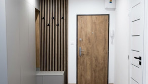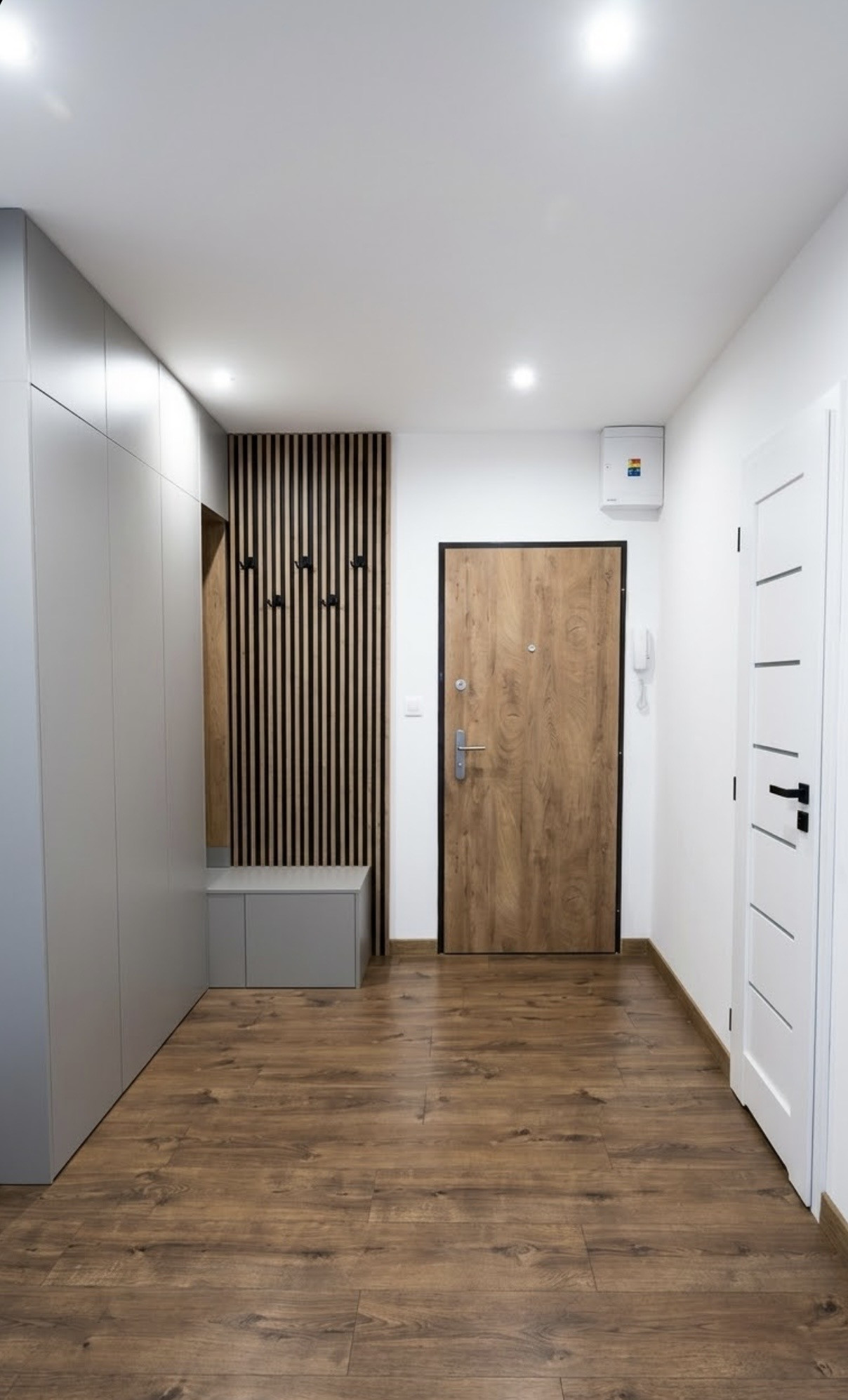 Predsieň: Elegantná vstupná chodba s nábytkom na mieru, šatníkovou skriňou a dizajnovou lamelovou stenou s vešiakmi.