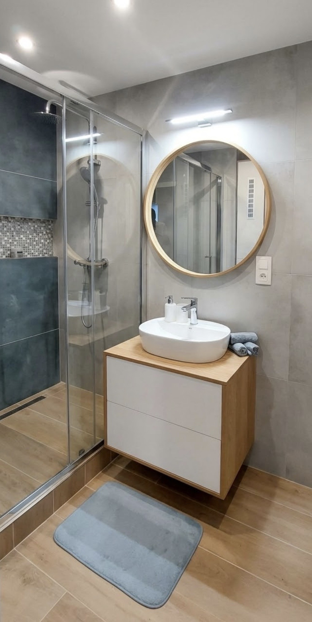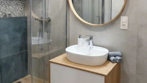 Kúpeľňa: Luxusný walk-in sprchový kút, umývadlo so skrinkou a zrkadlom, kvalitné obklady a dlažba.