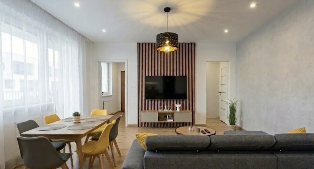 Obývacia izba s jedálňou: Srdce bytu s veľkou rohovou pohovkou, TV stenou a jedálenským kútom, ktorý farebne ladí s celým interiérom.