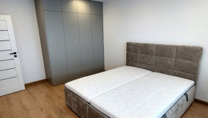 Spálňa: Priestranná izba s veľkou manželskou posteľou s úložným priestorom a šatníkovou skriňou na mieru.