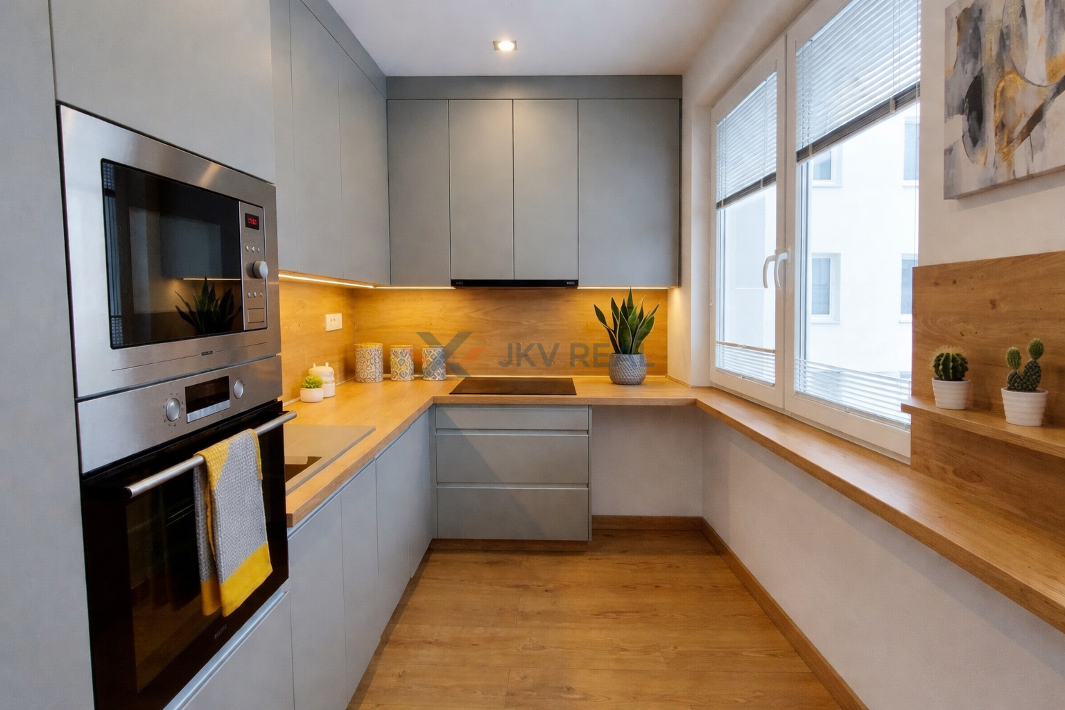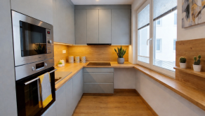 Samostatná kuchyňa: Moderná linka na mieru so zabudovanými spotrebičmi (rúra, mikrovlnka, varná doska) a dostatkom pracovnej plochy.