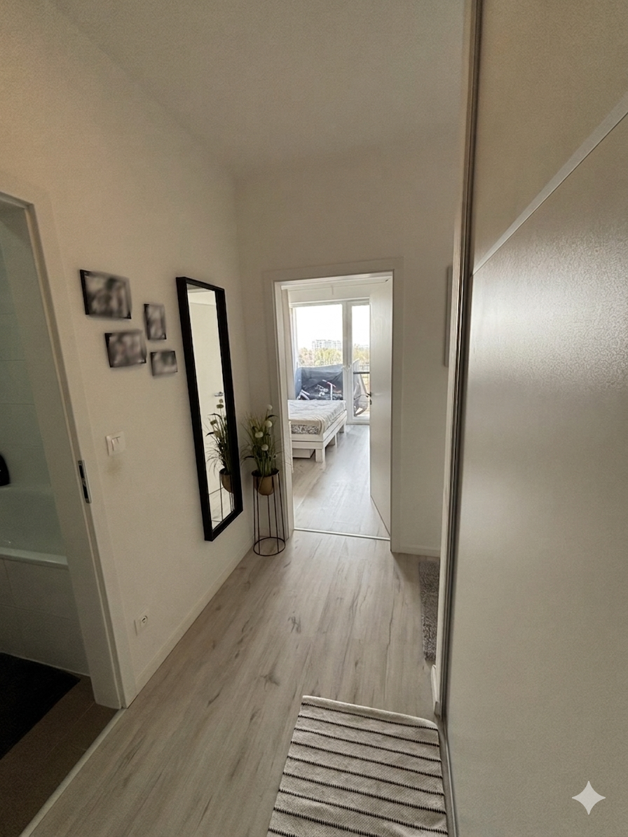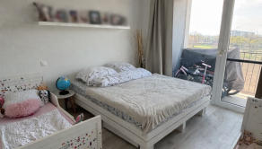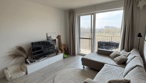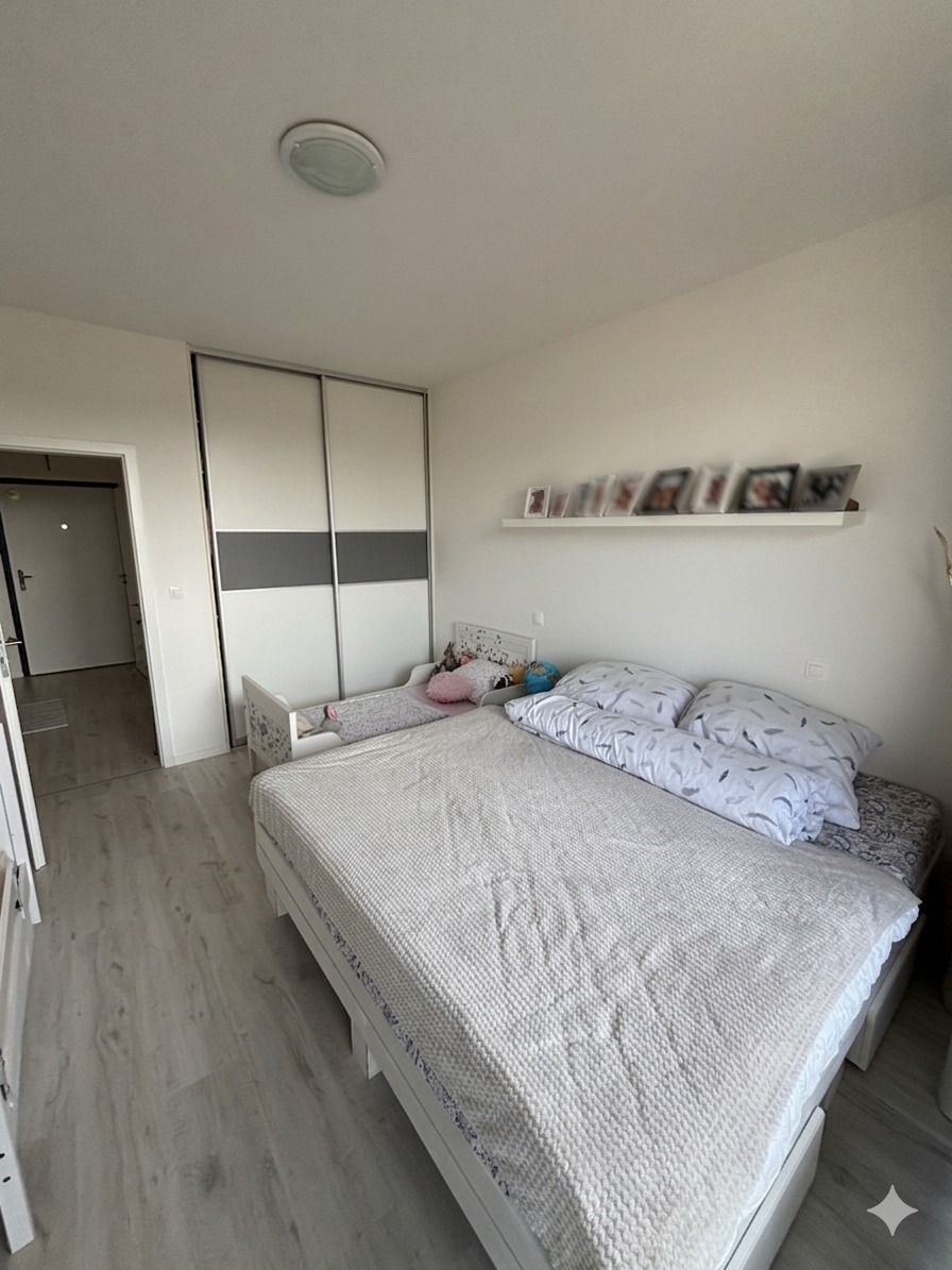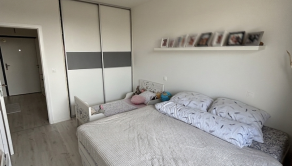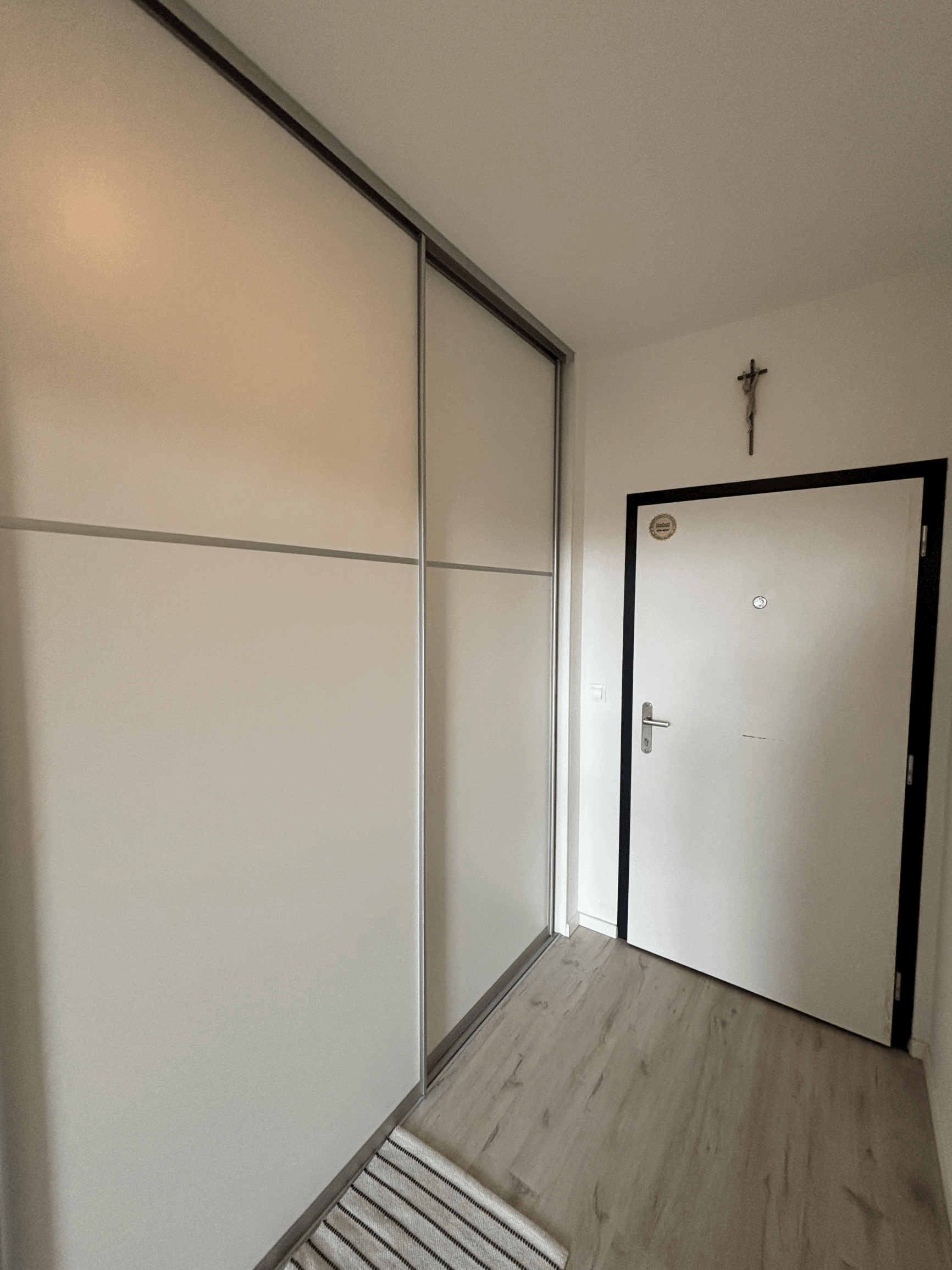 Dominantou bytu je vzdušná obývacia izba prepojená s kuchyňou, ktorá je vybavená kvalitnými spotrebičmi a nábytkom na mieru. Veľkou výhodou je priestranná spálňa, ktorá poskytuje dostatok miesta nielen na pohodlný spánok, ale aj na ďalšie úložné riešenia a pracovný kút. V byte sa nachádzajú veľké vstavané skrine – na chodbe aj v spálni, čo zabezpečuje nadštandardný úložný priestor.