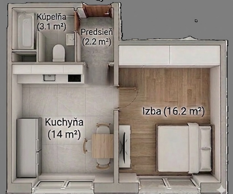 Fotografia kuchyne bude doplnená po dokončení posledných úprav a upratovania, byt bol čerstvo premaľovaný a pripravený pre nového nájomcu. Pôdorys je ilustračný.