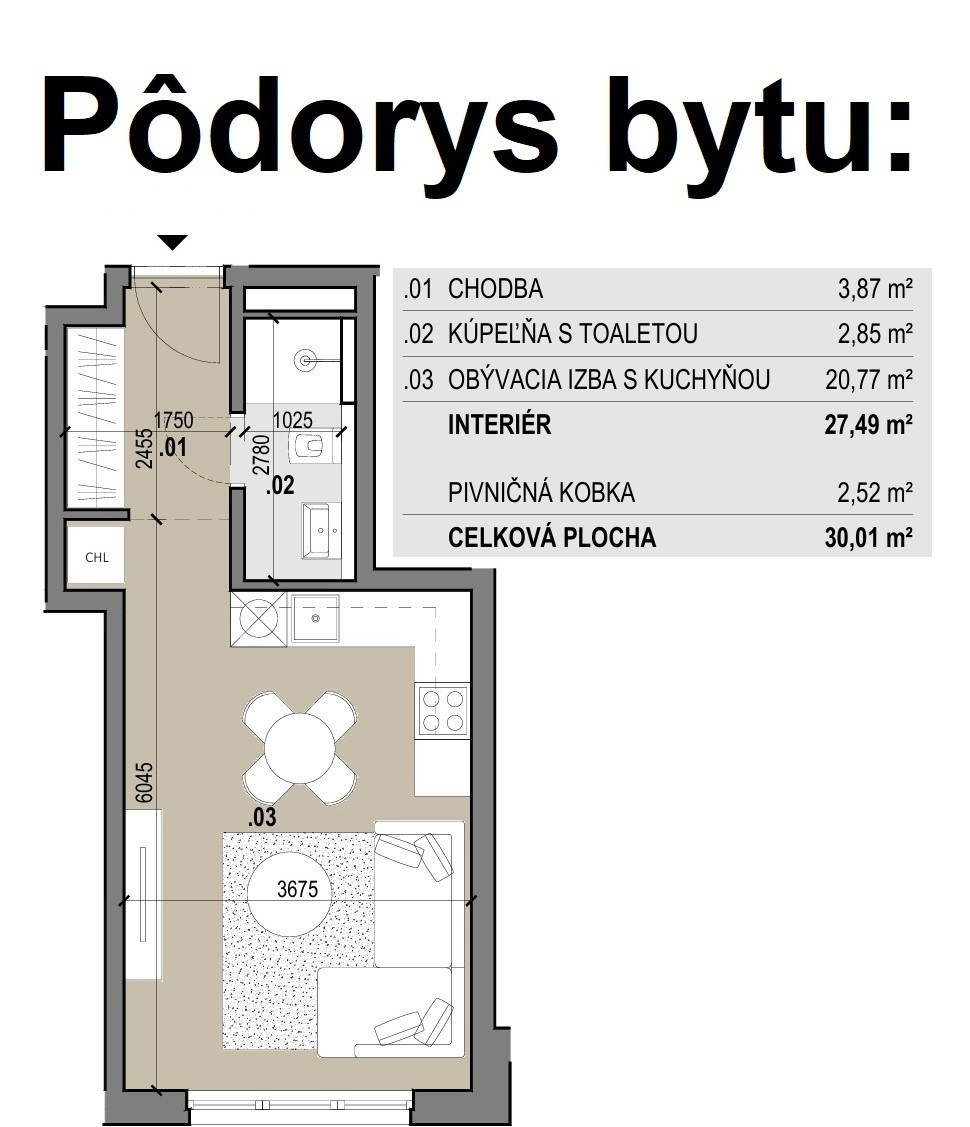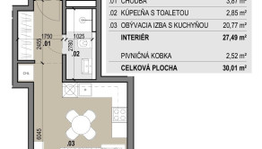 + výmera: 27,5 m² + pivnica 2,52 m²