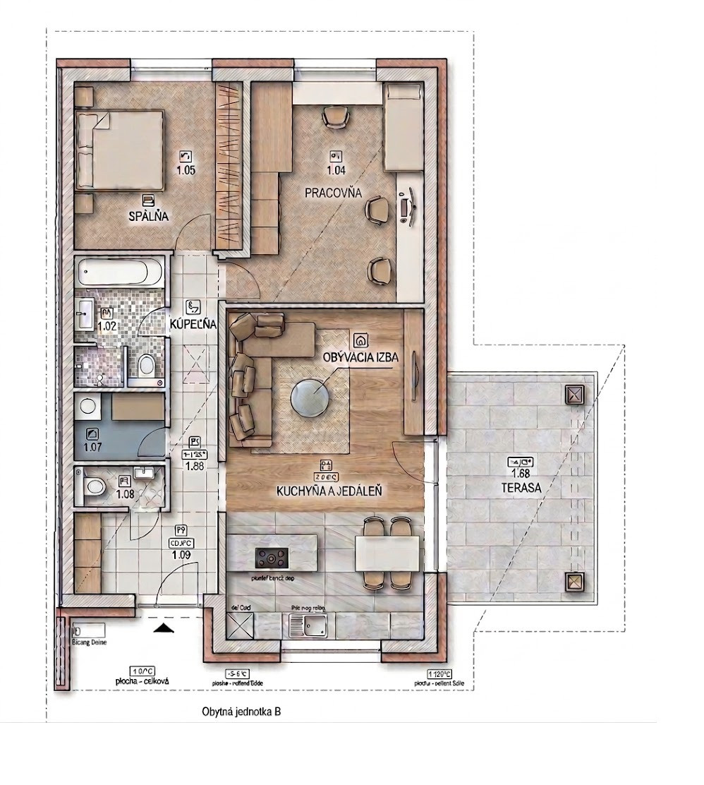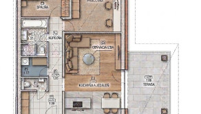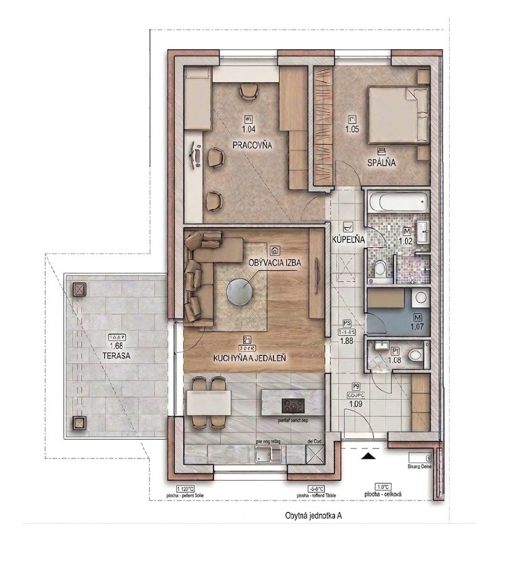 Srdcom nehnuteľnosti je priestranná obývacia izba prepojená s kuchyňou a jedálňou, ktorá vytvára otvorený a svetlý priestor. Veľkým benefitom je priamy výstup z obývacej izby na terasu, ktorá prirodzene rozširuje obytný priestor smerom do exteriéru a ponúka ideálne miesto na oddych, či stretnutia s rodinou a priateľmi. Nočná časť domu pozostáva zo spálne a ďalšej izby, ktorú je možné využiť ako detskú izbu alebo pracovňu. Praktickosť dispozície dopĺňa technická miestnosť, kúpeľňa s toaletou, ako aj samostatné WC, čo zvyšuje komfort bývania pre celú domácnosť.