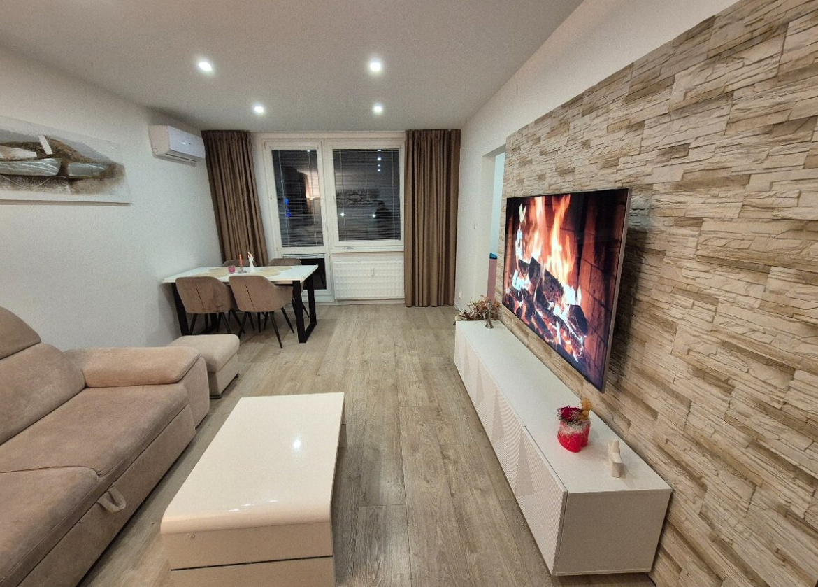 Byt sa prenajíma kompletne zariadený – stačí si priniesť osobné veci a bývate. K dispozícii je pohovka, postele, skrine, televízor aj práčka, takže všetko potrebné už máte pripravené.