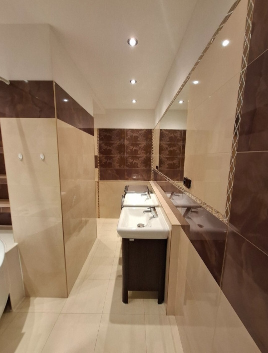 kúpeľňa s vaňou, dvomi umývadlami a práčkou