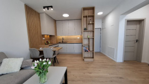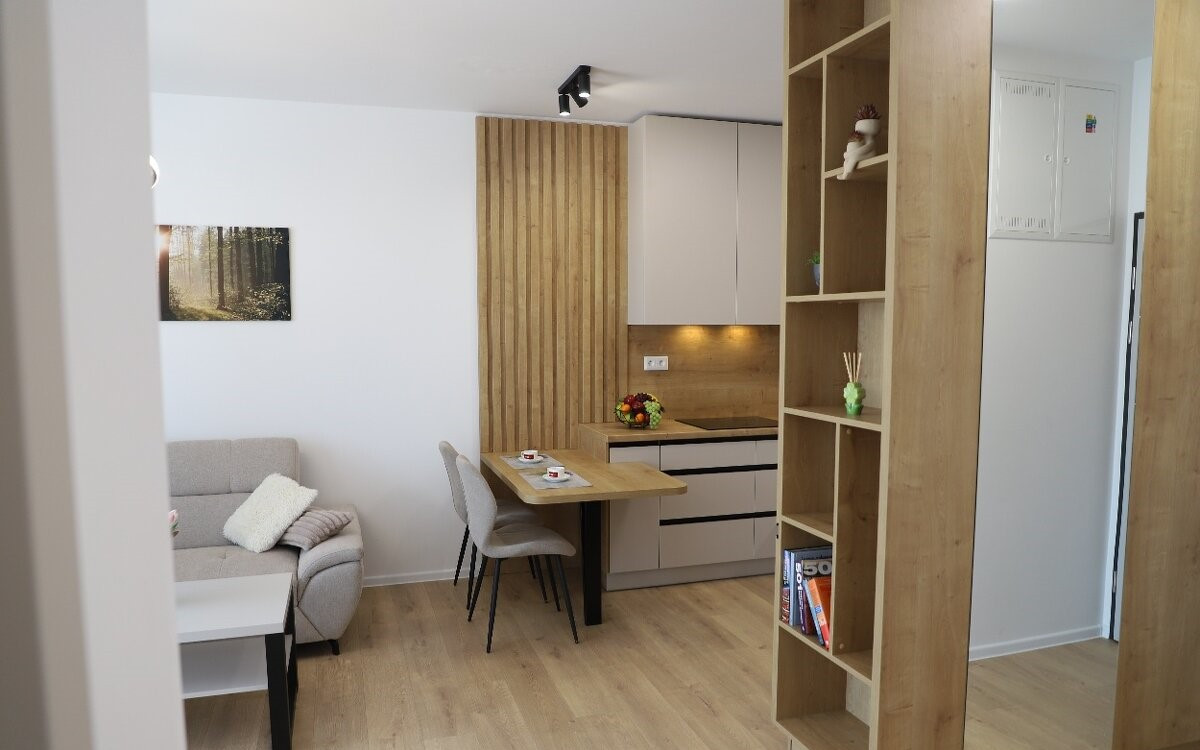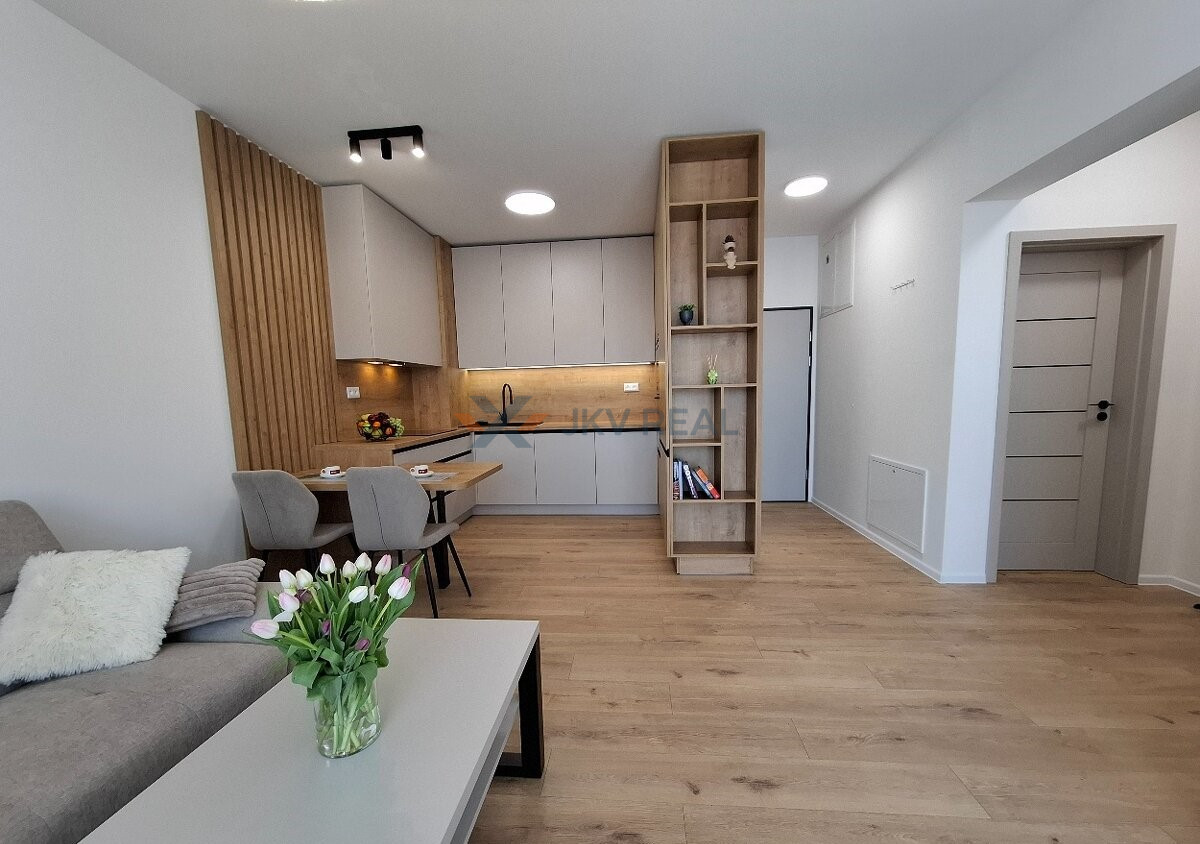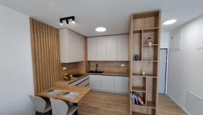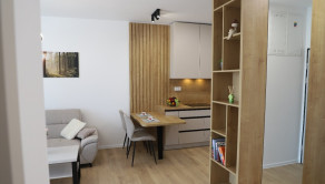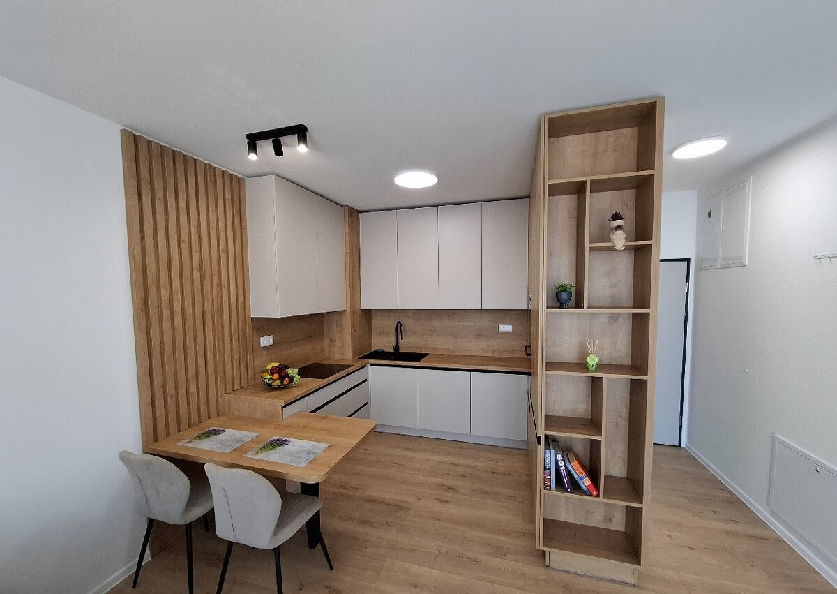 Vybavenie na mieru: Celý interiér je navrhnutý a zariadený kvalitným nábytkom vyrobeným na mieru, ktorý efektívne využíva každý štvorcový meter. Veľkosť bytu je 53 m2. V byte sa nachádza vlastný šatník.