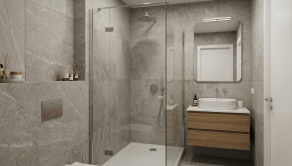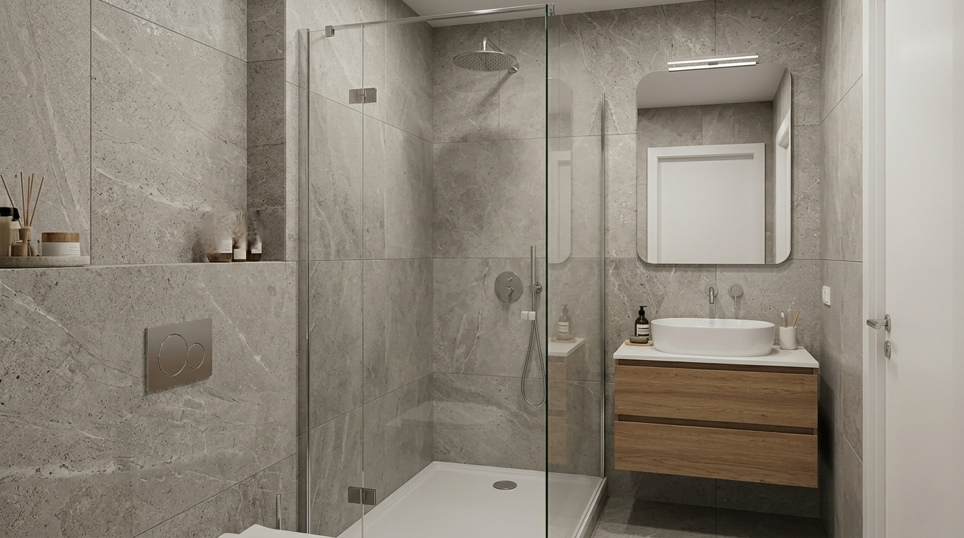 Moderná kúpeľňa: Kompaktná kúpeľňa so sprchovým kútom je moderne prepojená s WC, čo vytvára čistý a vzdušný priestor.