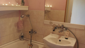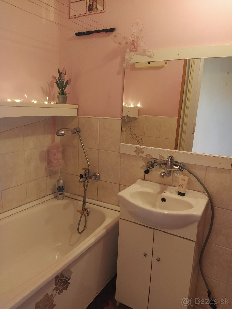 Kúpeľňa je prakticky riešená – nájdete tu sprchový kút aj vaňu, toaletu, umývadlo a priestor na práčku, čo ocení každý, kto hľadá funkčné bývanie.