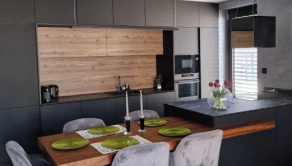 Kuchyňa je plne vybavená spotrebičmi (umývačka, indukčná doska, rúra, vstavaná chladnička).