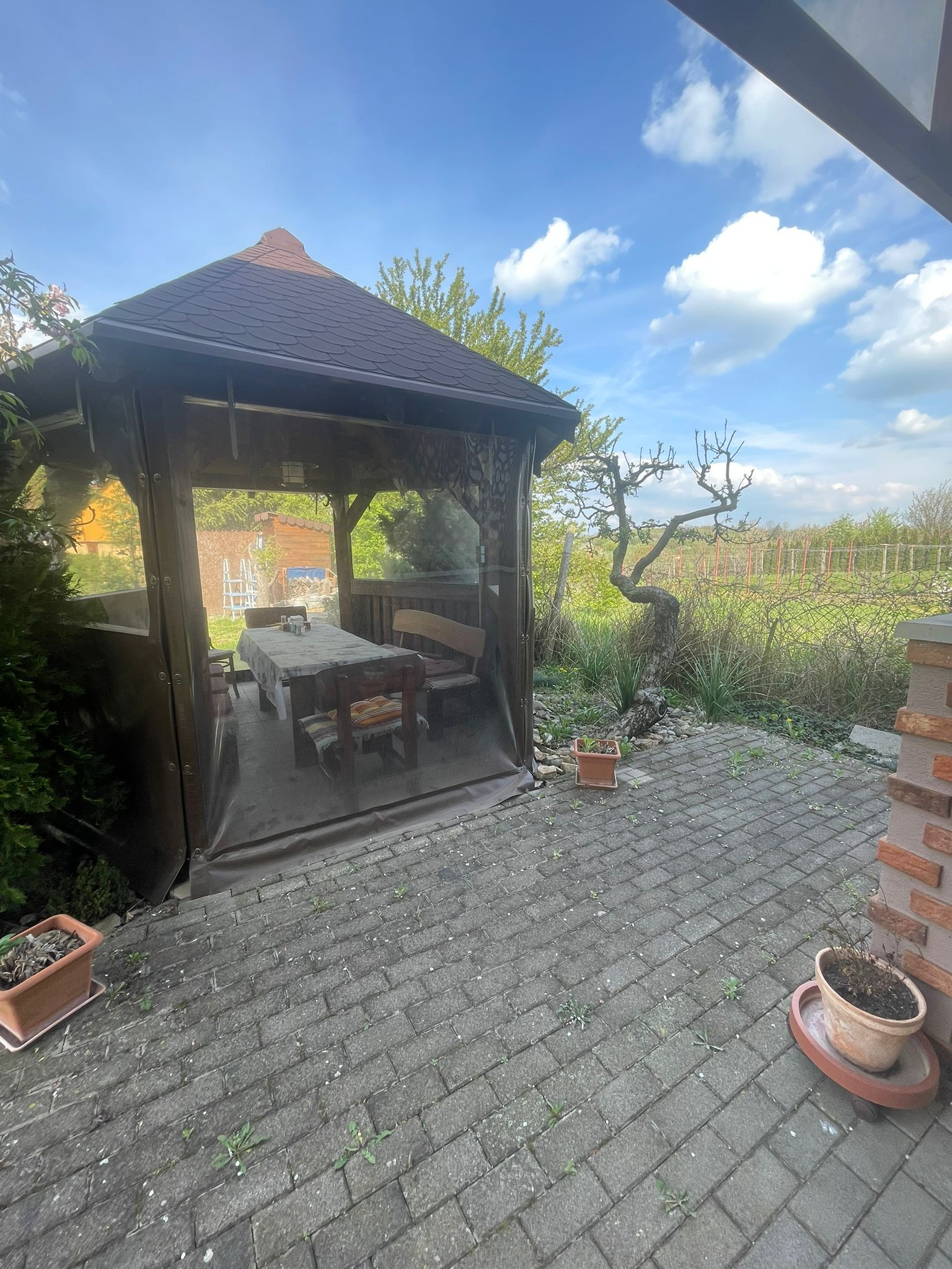 Na pozemku sa nachádza aj už vybudovaný altánok, ideálny na posedenia s rodinou a priateľmi, kde si môžete vychutnať príjemné chvíle a každý vám bude obdivovať miesto, na ktorom sa práve nachádzate.