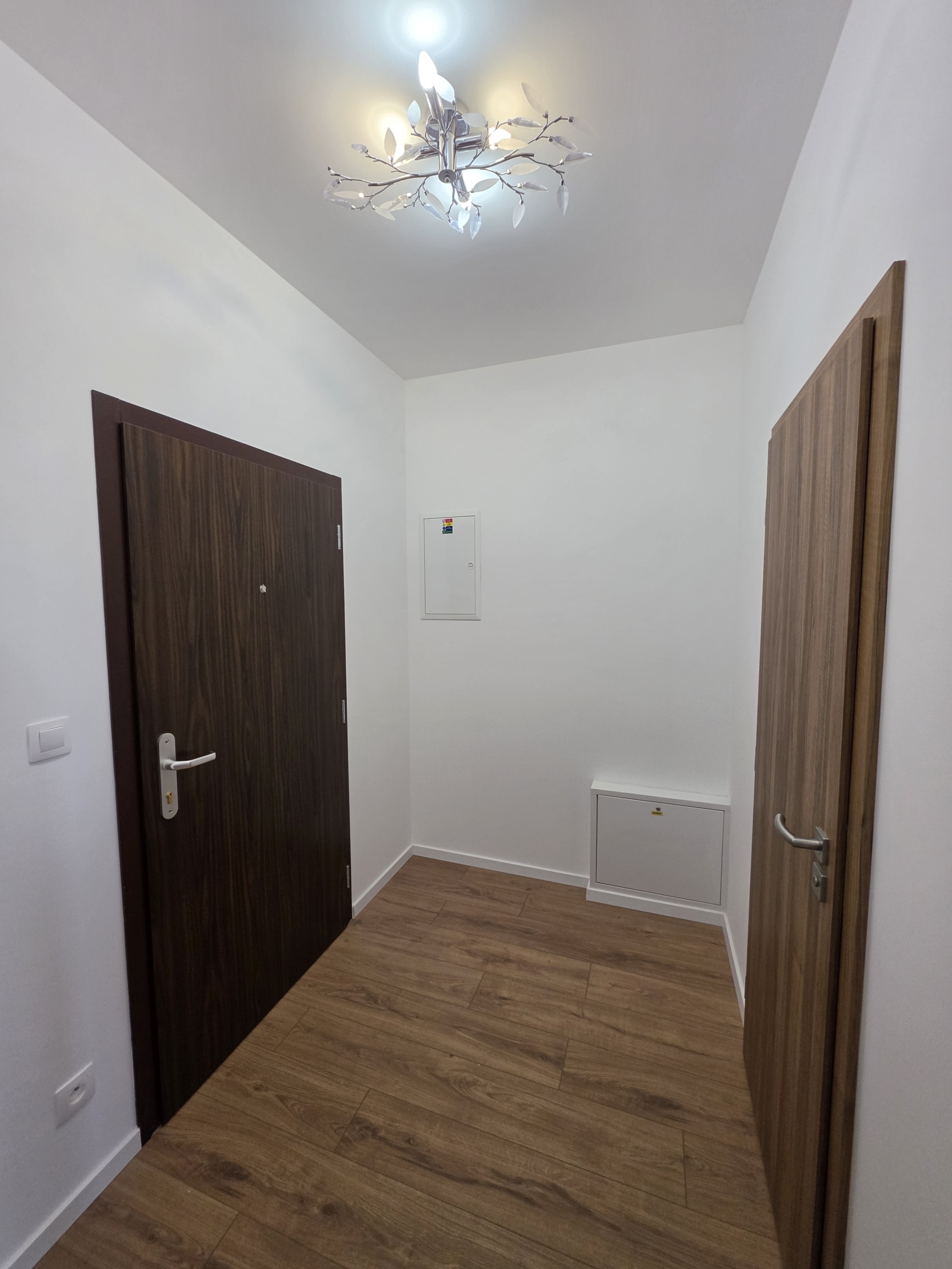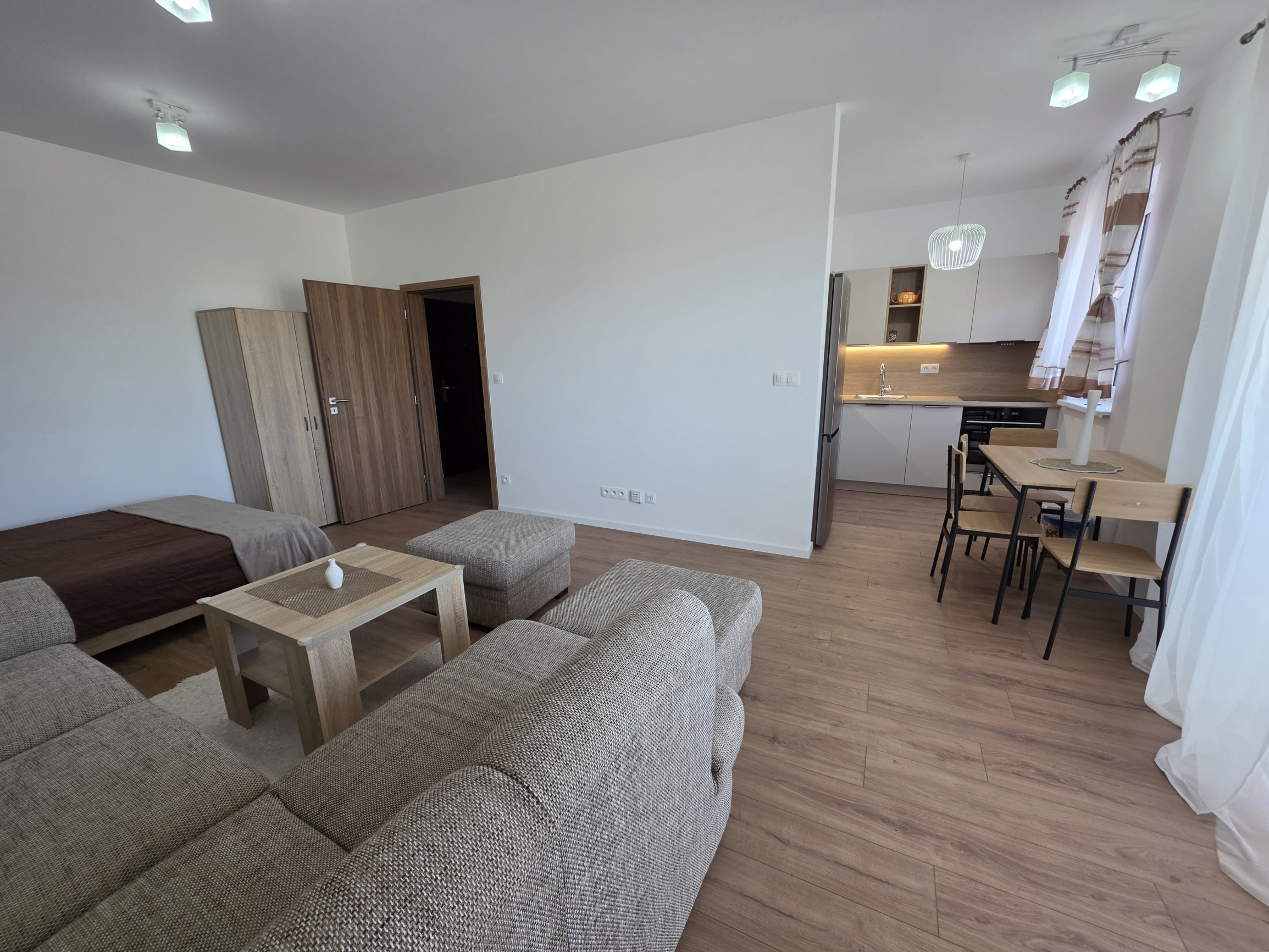 Dispozícia bytu je praktická a vzdušná – pozostáva z obývacej časti prepojenej s kuchyňou, kúpeľne s WC a vstupnej chodby. Príjemným benefitom je balkón o výmere 3,2 m², ktorý poskytuje priestor na relax.